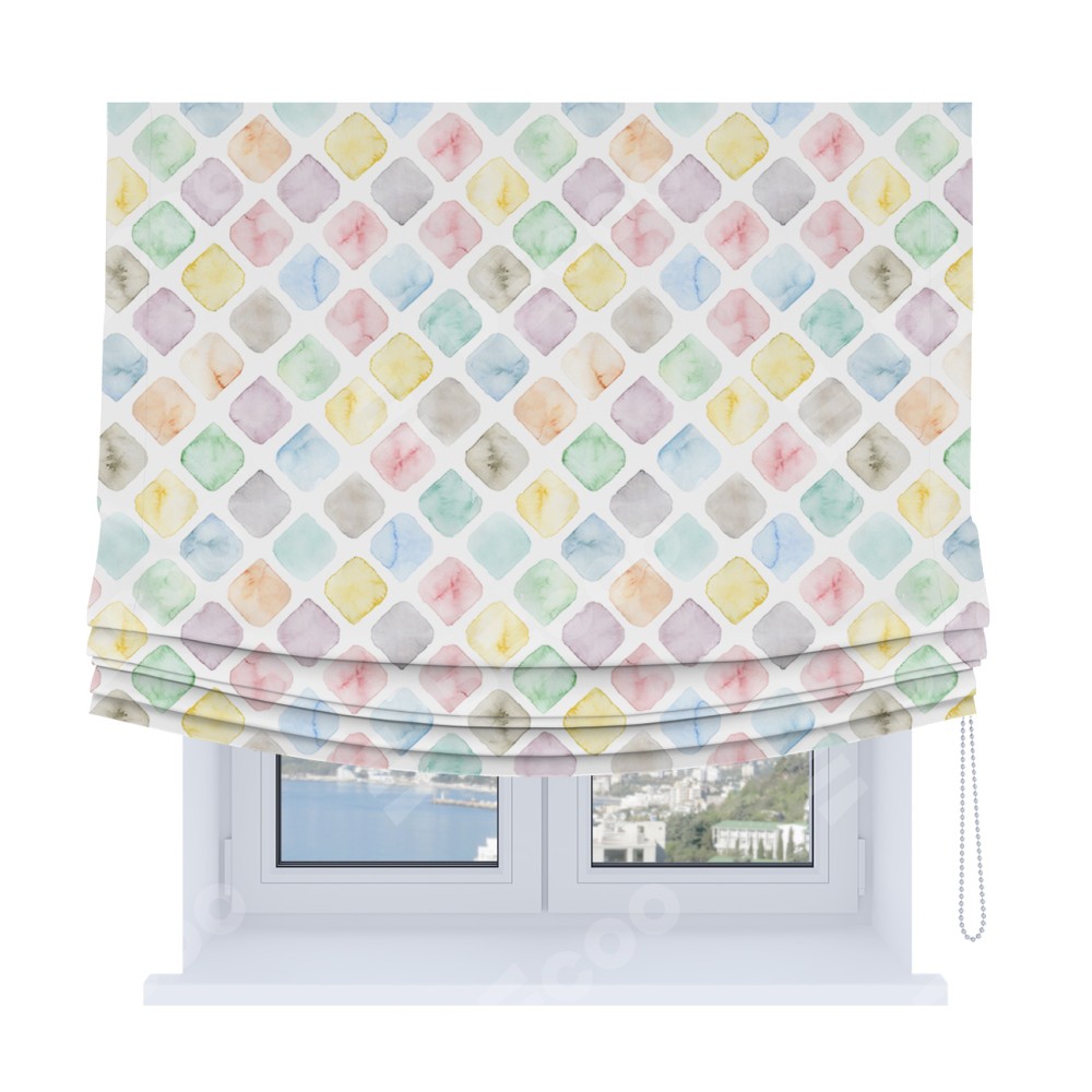 Римская штора Soft производителя «Cortin», используется для проёма, пошита из ткани блэкаут с нанесением сублимационной печати «Мозаика акварель». Имеет универсальный механизм и подходит для монтажа: на потолок, на стену и в нишу. В отличие от стандартных римских штор, римская штора Soft не имеет горизонтальных вставок и нижнего отвеса. Это позволяет ткани произвольно драпироваться в свободные мягкие складки.