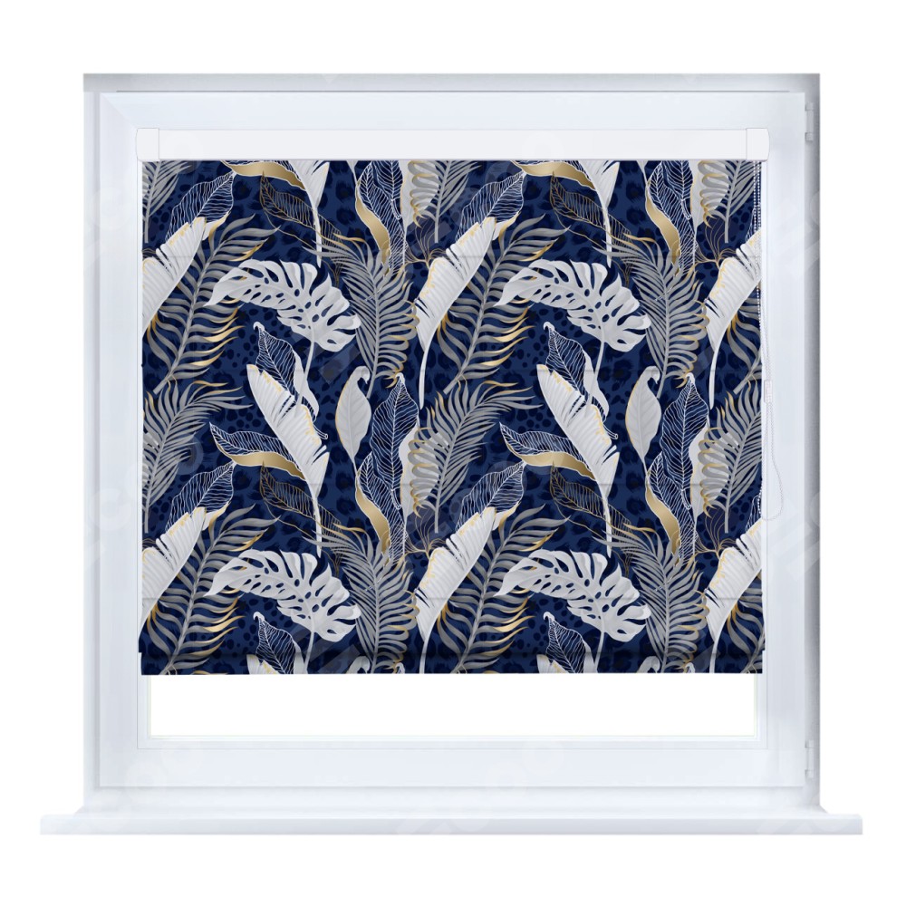Римская штора производителя «Cortin», устанавливается на створку окна, пошита из ткани блэкаут с нанесением сублимационной печати «Сине-золотые джунгли». Штора шьётся по индивидуальным размерам, для данного типа римской шторы возможная ширина от 35 до 150 см., высота до 250 см.