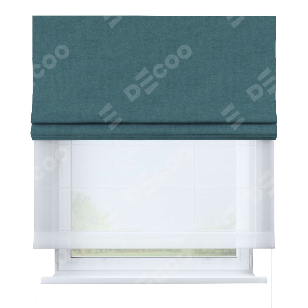 Римская штора день-ночь производителя «Cortin», используется для проёма, пошита из двух полотен, с лицевой стороны канвас ментоловый артикул v-114, вторая ткань тюль (по стандарту комплектуется тюль белого цвета артикул V-01). Имеет универсальный механизм и подходит для монтажа: на потолок, на стену и в нишу.