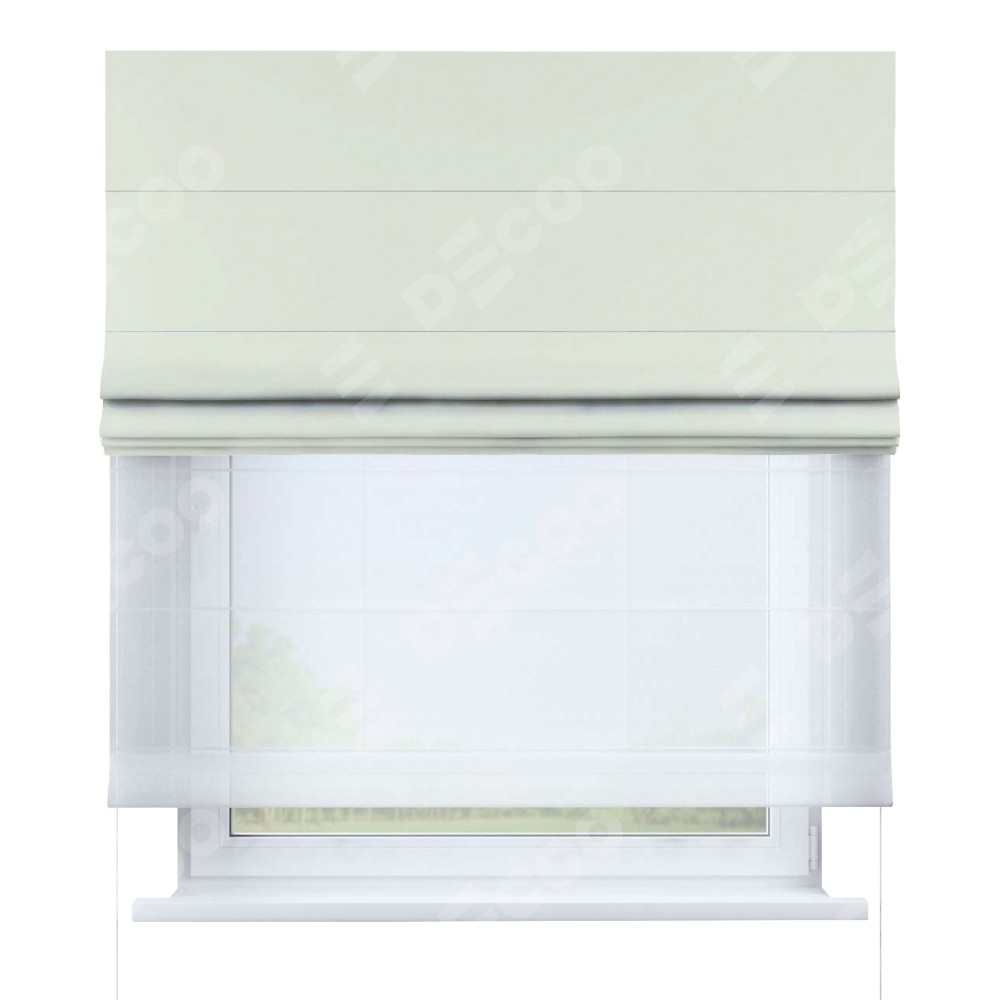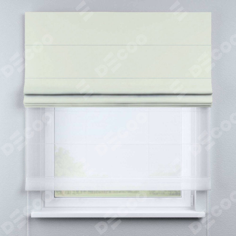 Римская штора день-ночь производителя «Cortin», используется для проёма, пошита из двух полотен, с лицевой стороны канвас сливочный артикул v-94, вторая ткань тюль (по стандарту комплектуется тюль белого цвета артикул V-01). Имеет универсальный механизм и подходит для монтажа: на потолок, на стену и в нишу.