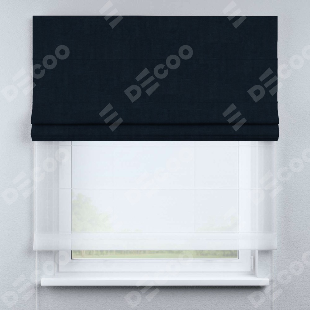 Римская штора день-ночь производителя «Cortin», используется для проёма, пошита из двух полотен, с лицевой стороны канвас тёмно-синий артикул v-206, вторая ткань тюль (по стандарту комплектуется тюль белого цвета артикул V-01). Имеет универсальный механизм и подходит для монтажа: на потолок, на стену и в нишу.