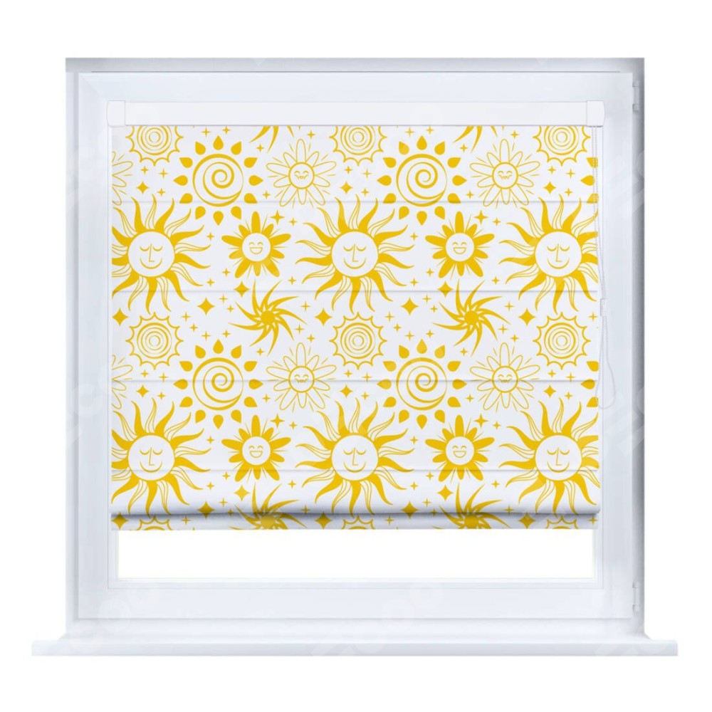 Римская штора производителя «Cortin», устанавливается на створку окна, пошита из ткани блэкаут с нанесением сублимационной печати «Солнышки». Штора шьётся по индивидуальным размерам, для данного типа римской шторы возможная ширина от 35 до 150 см., высота до 250 см.