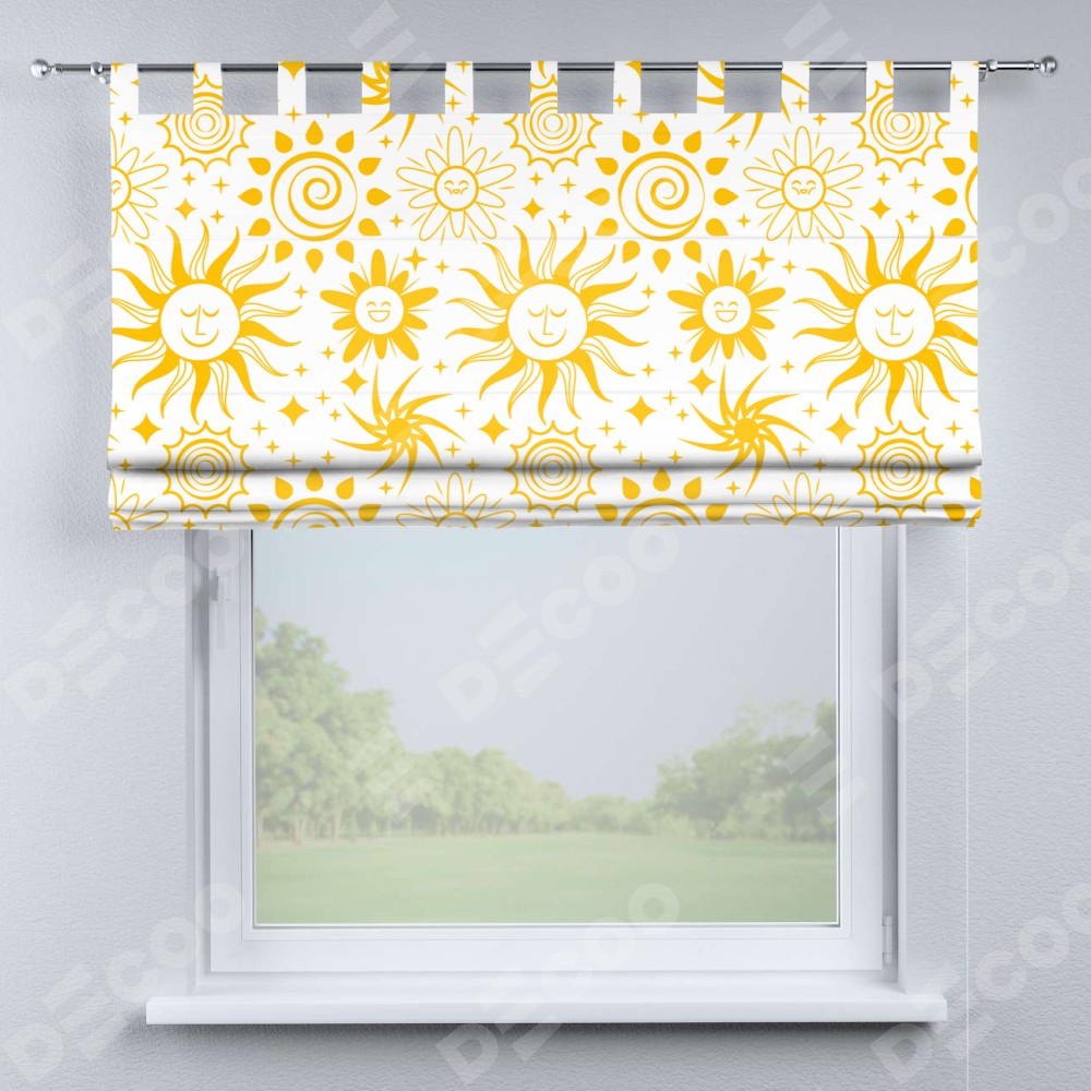 Римская штора производителя «Cortin», используется для проёма, пошита из ткани блэкаут с нанесением сублимационной печати «Солнышки». Данная модель пошита на петлях, комплектуется на выбор круглым карнизом и подходит для монтажа на стену. Римская штора на петлях имеет простую систему регулировки высоты, отличительным преимуществом данной модели является простой способ монтажа. Достаточно повесить ее на трубу и штора готова!