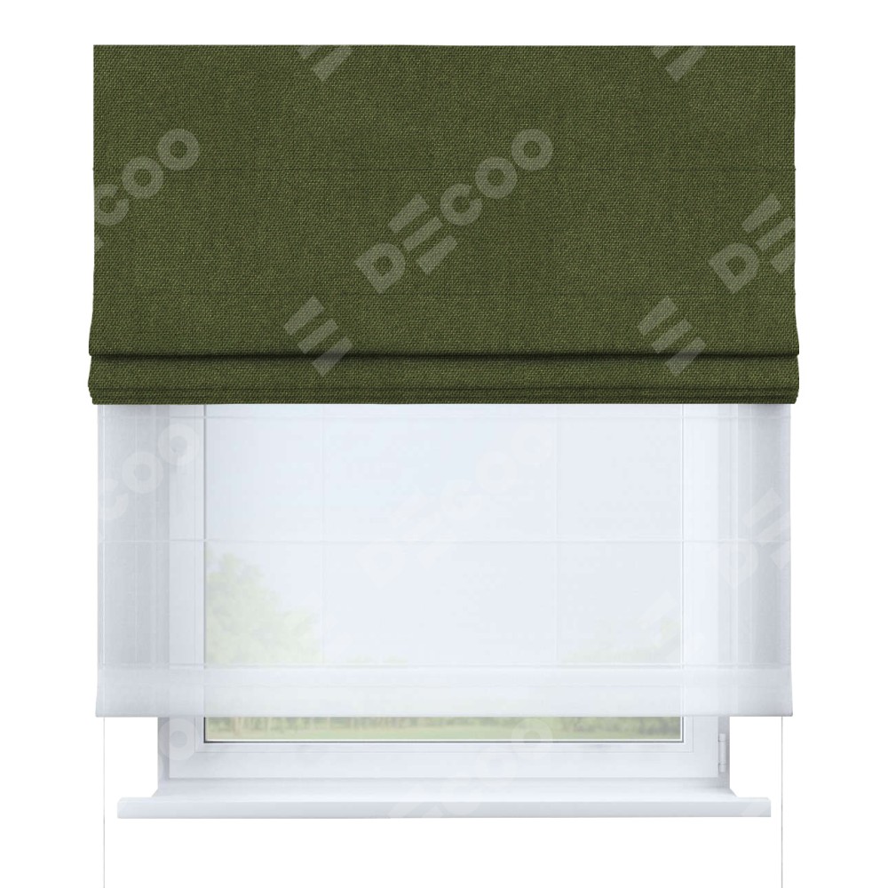 Римская штора день-ночь производителя «Cortin», используется для проёма, пошита из двух полотен, с лицевой стороны лён димаут салатовый артикул 91002, вторая ткань тюль (по стандарту комплектуется тюль белого цвета артикул V-01). Имеет универсальный механизм и подходит для монтажа: на потолок, на стену и в нишу.