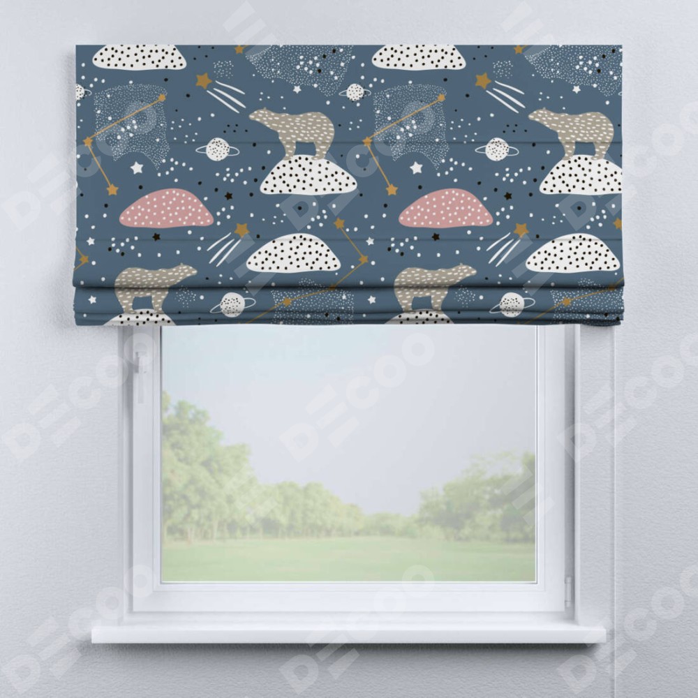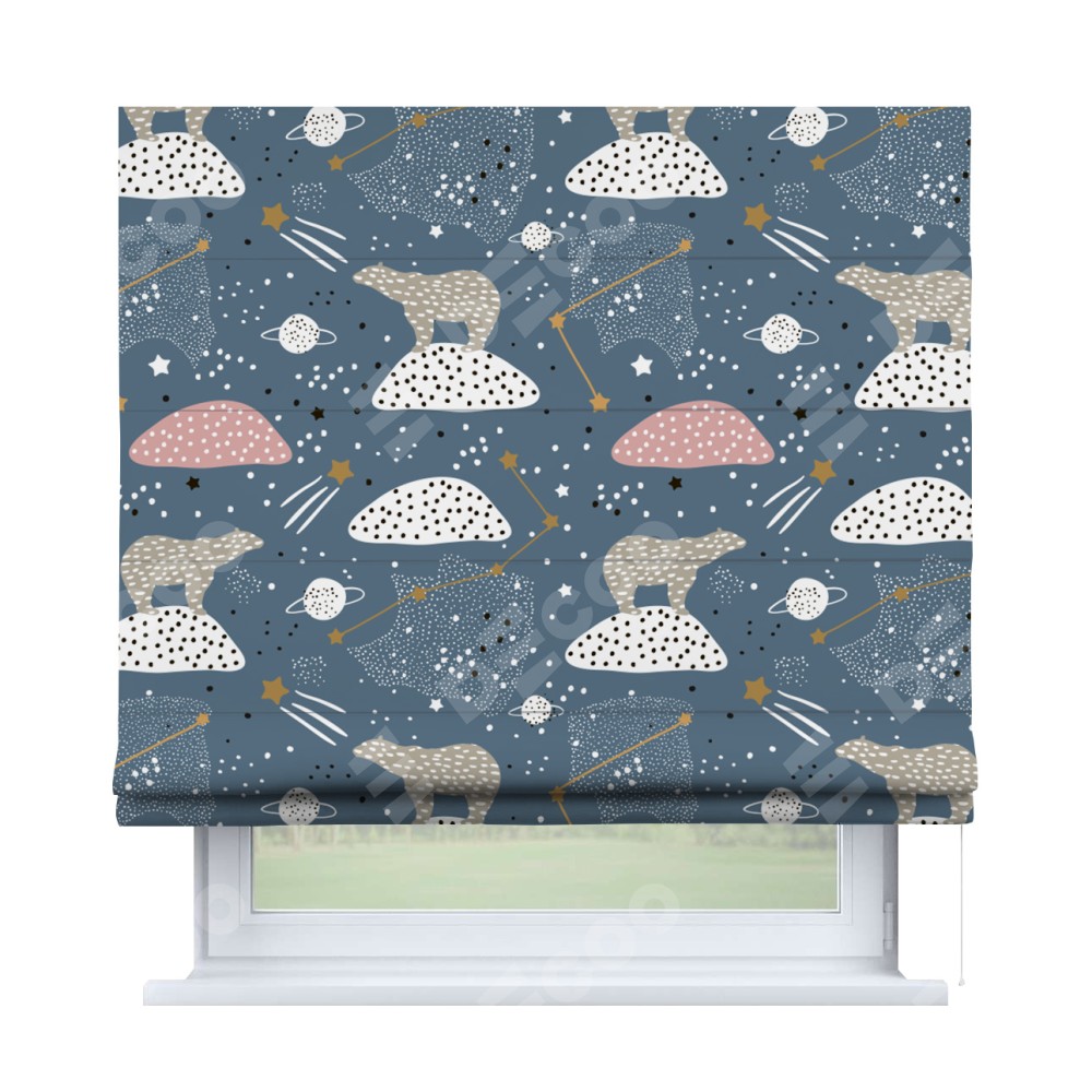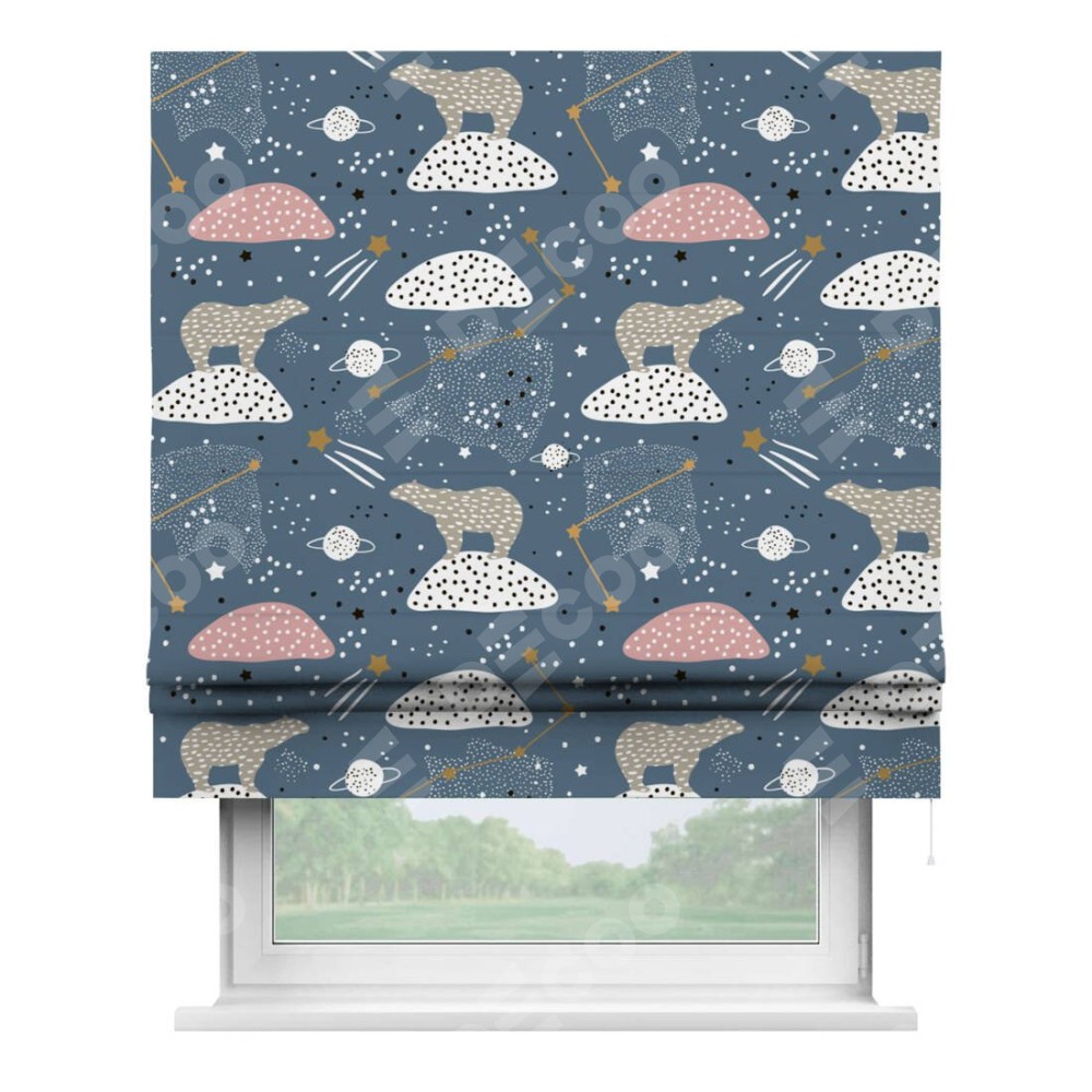 Римская штора производителя «Cortin», используется для проёма, пошита из ткани блэкаут с нанесением сублимационной печати «Белые медведи». Имеет универсальный механизм и подходит для монтажа: на потолок, на стену и в нишу.