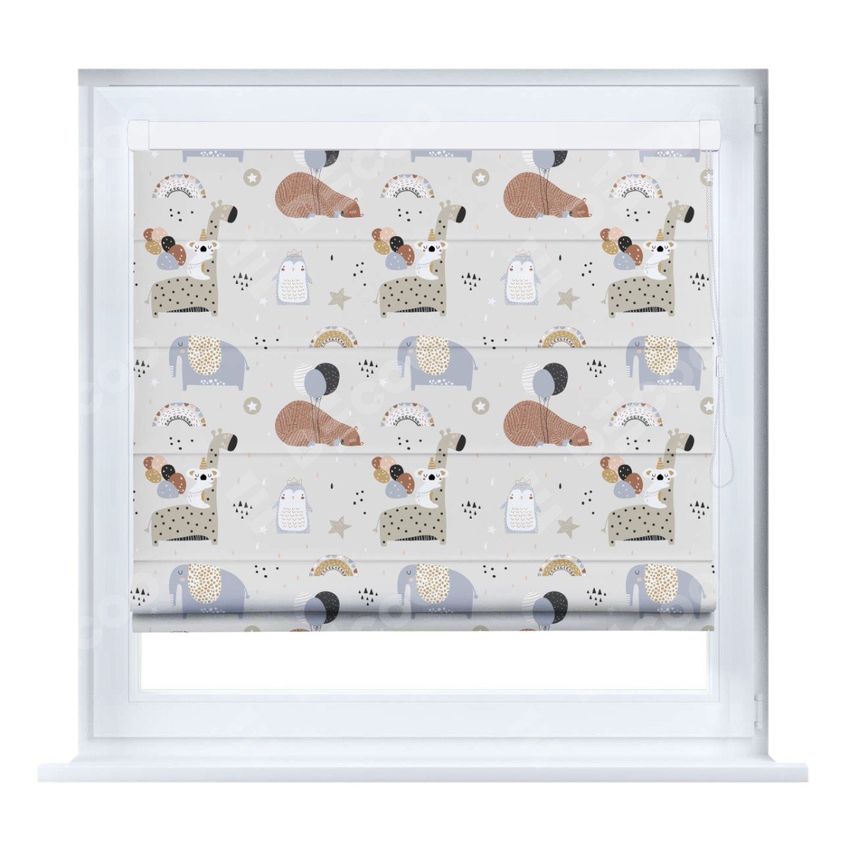 Римская штора кассетного типа, производителя «Cortin», устанавливается только на пластиковые окна и прилегает к стеклопакету, пошита из ткани блэкаут с нанесением сублимационной печати «Вечеринка животных».