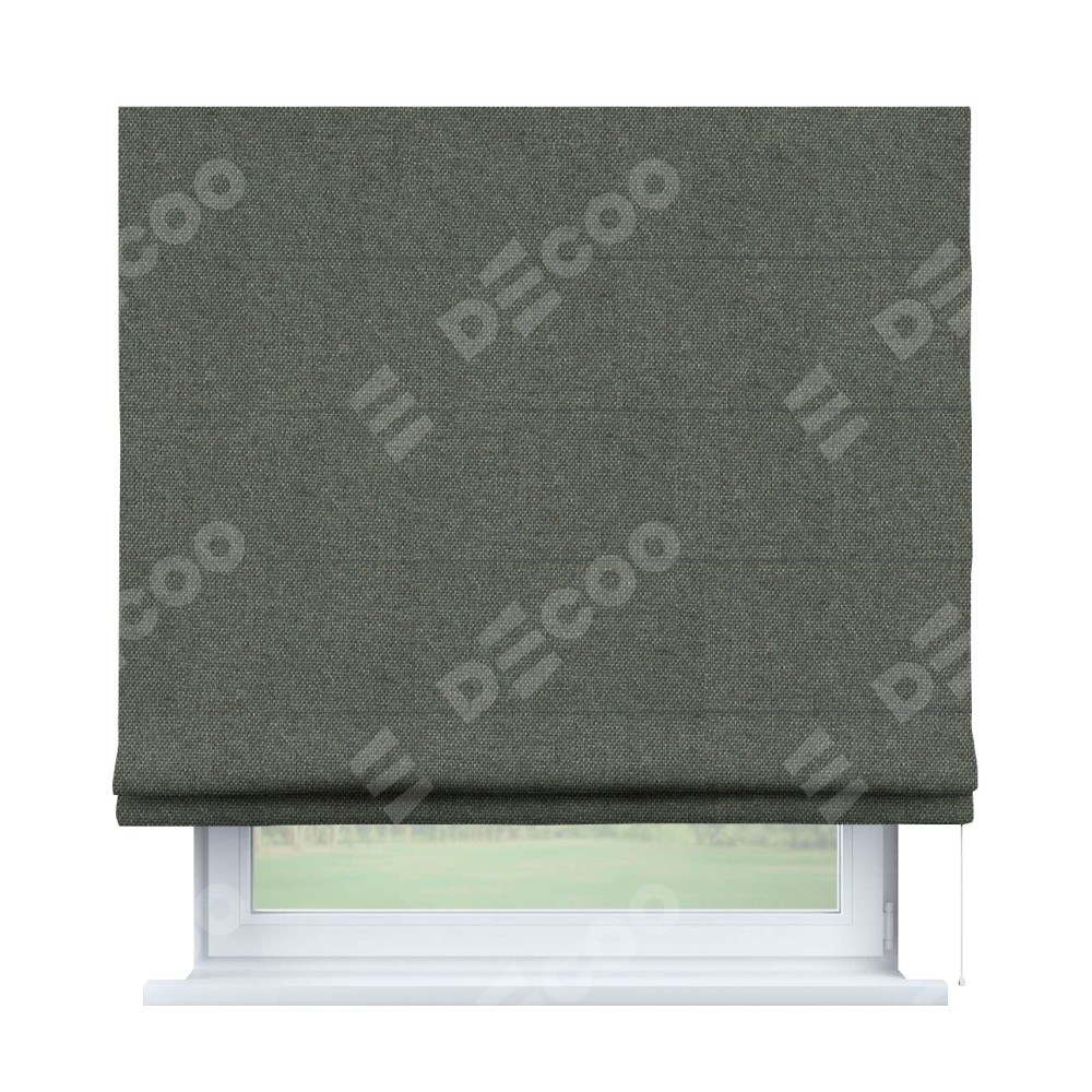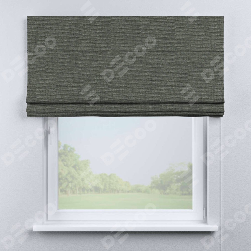 Римская штора производителя «Cortin», используется для проёма, пошита из ткани лён димаут тёмно-серый, артикул ткани 91011. Имеет универсальный механизм и подходит для монтажа: на потолок, на стену и в нишу.