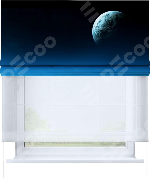 Римская штора день-ночь производителя «Cortin», используется для проёма, пошита из двух полотен, с лицевой блэкаут с нанесением сублимационной печати «Горизонты вселенной», вторая ткань тюль (по стандарту комплектуется тюль белого цвета артикул V-01). Имеет универсальный механизм и подходит для монтажа: на потолок, на стену и в нишу.