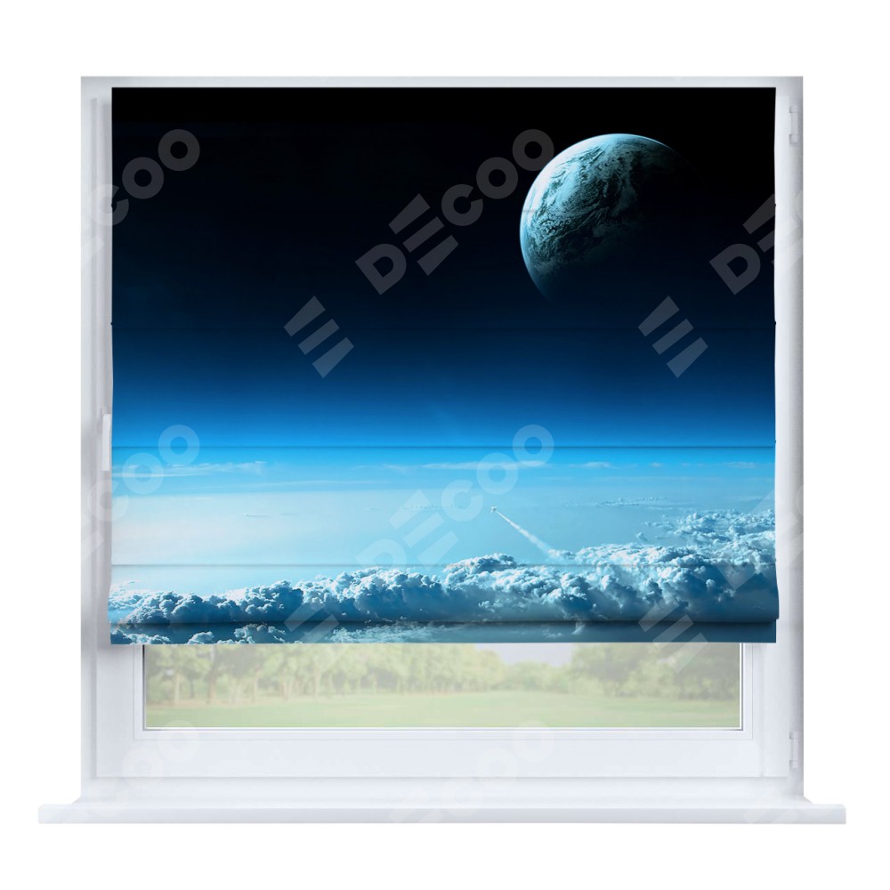 Римская штора производителя «Cortin», устанавливается на створку окна, пошита из ткани блэкаут с нанесением сублимационной печати «Горизонты вселенной». Штора шьётся по индивидуальным размерам, для данного типа римской шторы возможная ширина от 35 до 150 см., высота до 250 см.