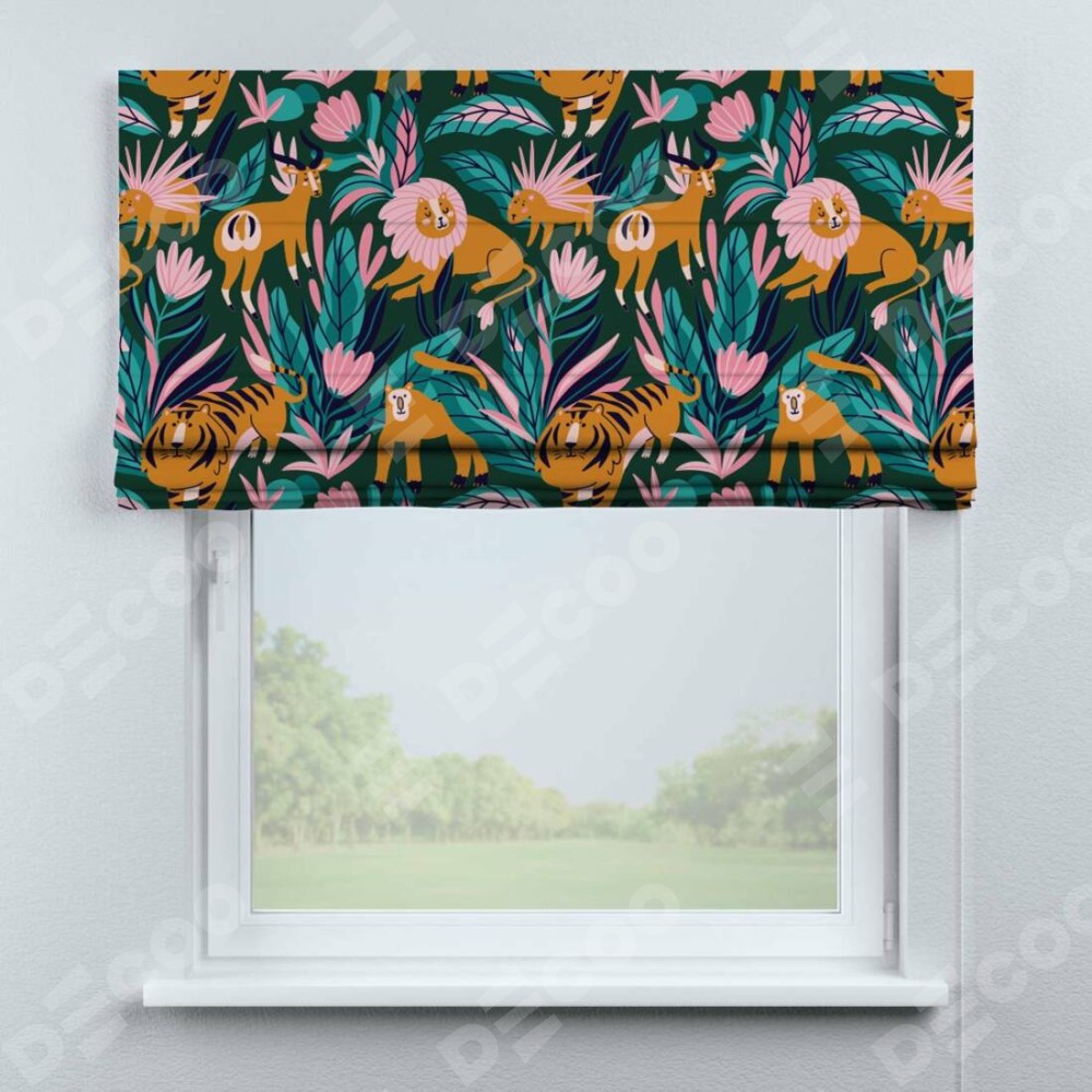 Римская штора производителя «Cortin», используется для проёма, пошита из ткани блэкаут с нанесением сублимационной печати «Дикие животные». Имеет универсальный механизм и подходит для монтажа: на потолок, на стену и в нишу.