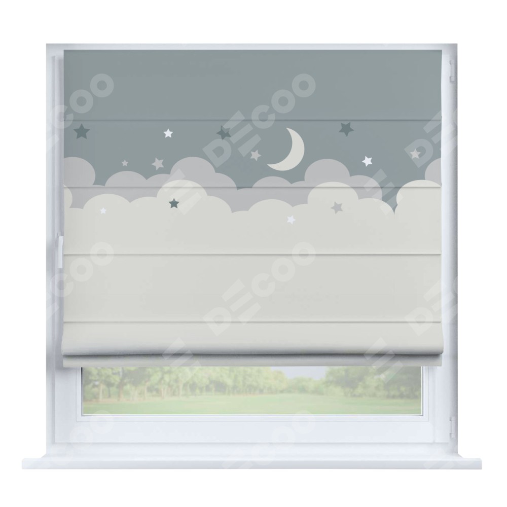 Римская штора производителя «Cortin», устанавливается на створку окна, пошита из ткани блэкаут с нанесением сублимационной печати «Ночные облака». Штора шьётся по индивидуальным размерам, для данного типа римской шторы возможная ширина от 35 до 150 см., высота до 250 см.