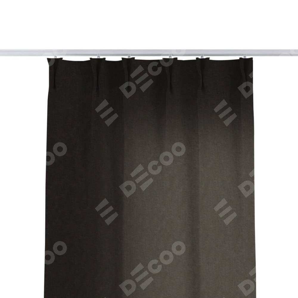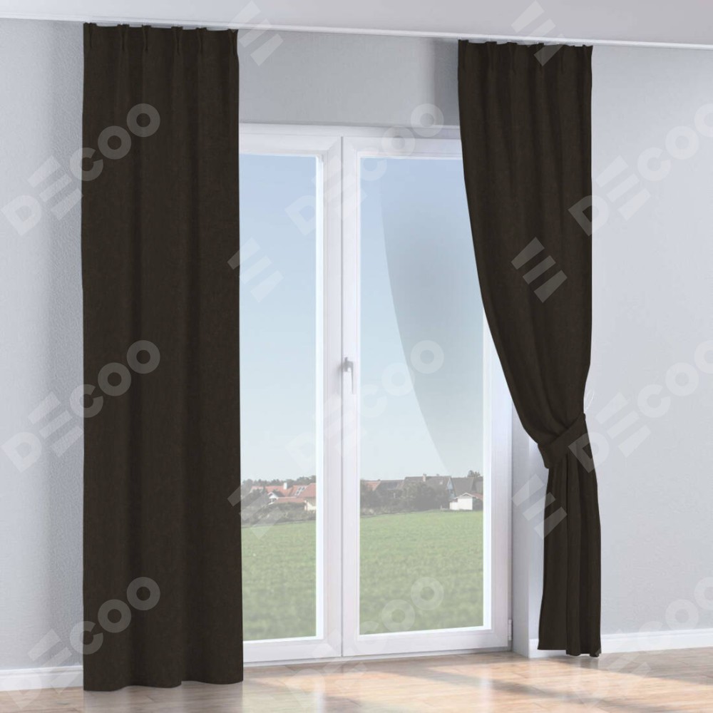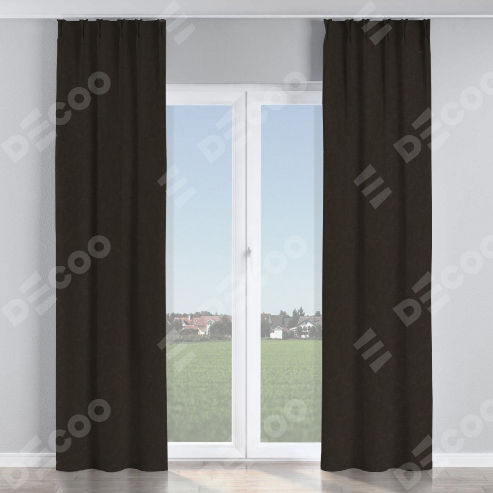Комплект прямых штор, от производителя «Cortin», пошиты из ткани канвас тёмно-коричневый, артикул ткани v-13. С изнаночной стороны в верхней части штор пристрачивается шторная лента с декоративными складками «Кустик». Для создания элегантных складок прямые шторы шьются по стандарту с коэффициентом 1:2 (на 100 см. ширины проёма 200 см. ширины ткани).