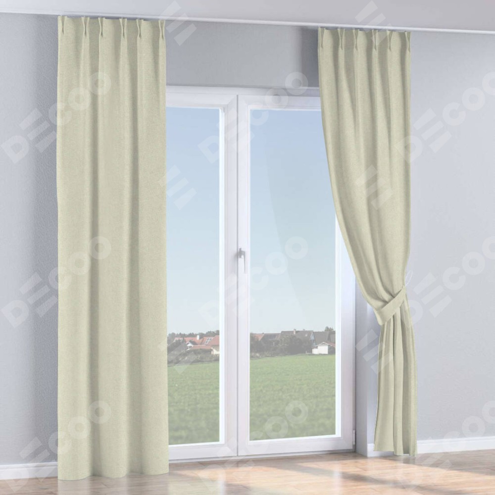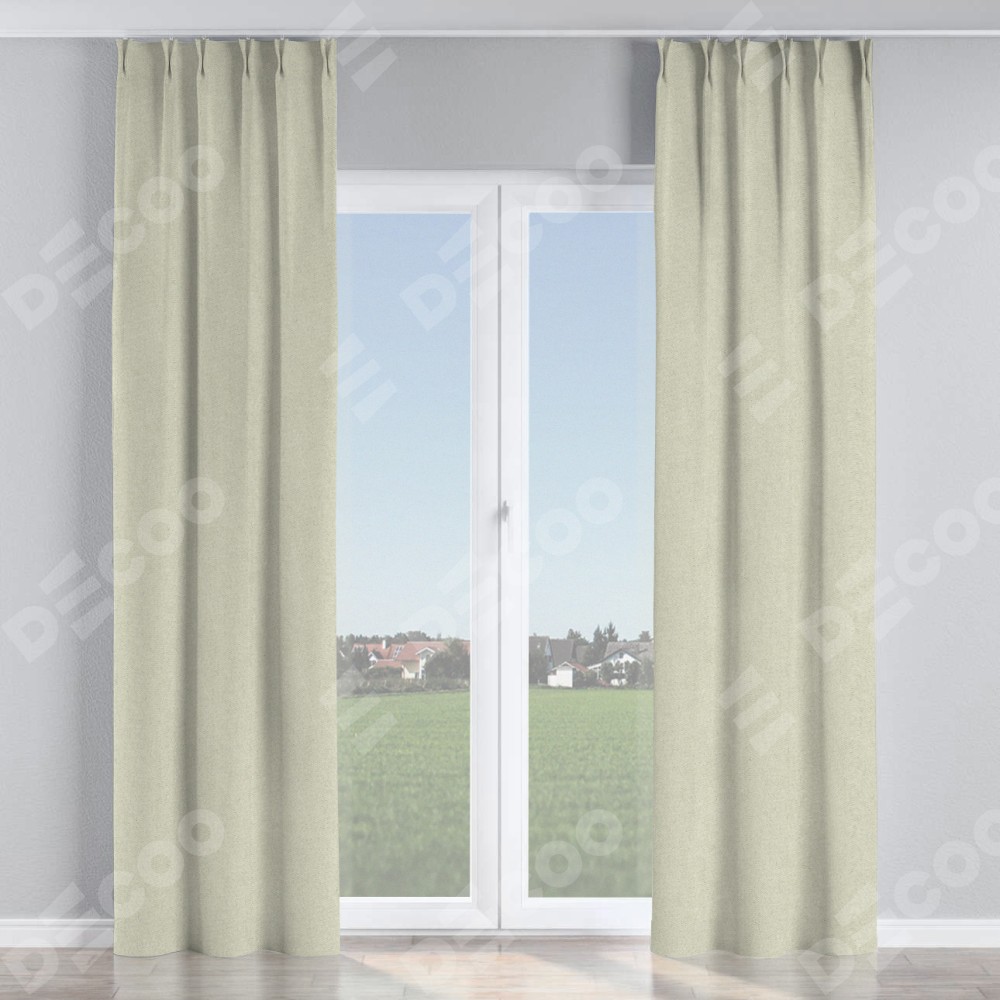 Комплект прямых штор, от производителя «Cortin», пошиты из ткани твид блэкаут шампань, артикул ткани 90929. С изнаночной стороны в верхней части штор пристрачивается шторная лента с декоративными складками «Кустик». Для создания элегантных складок прямые шторы шьются по стандарту с коэффициентом 1:2 (на 100 см. ширины проёма 200 см. ширины ткани).