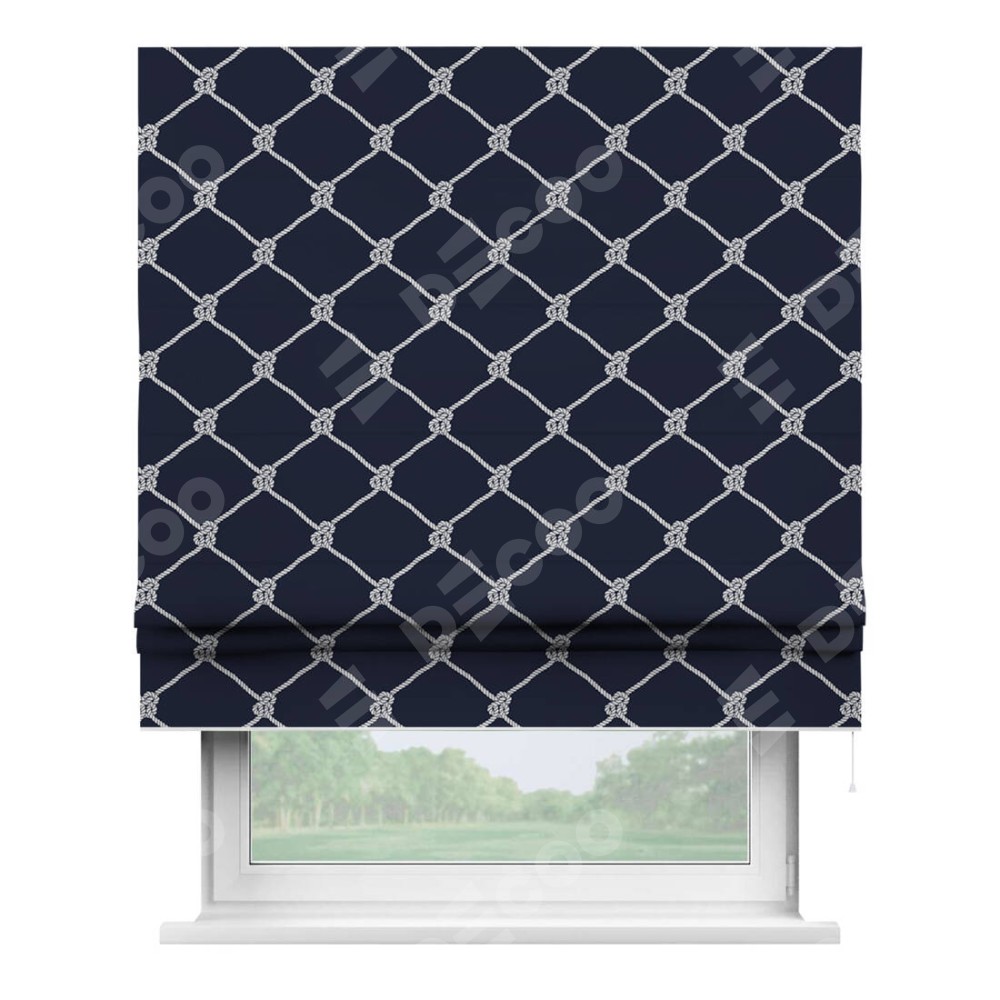 Римская штора производителя «Cortin», используется для проёма, пошита из ткани блэкаут с нанесением сублимационной печати «Морские веревки». Имеет универсальный механизм и подходит для монтажа: на потолок, на стену и в нишу.