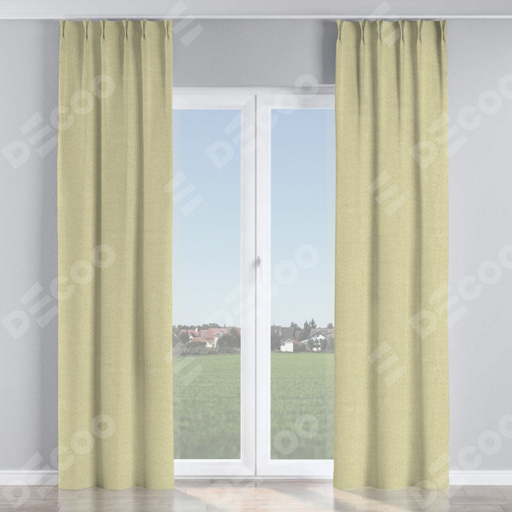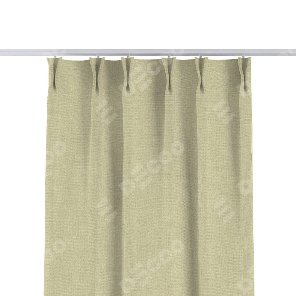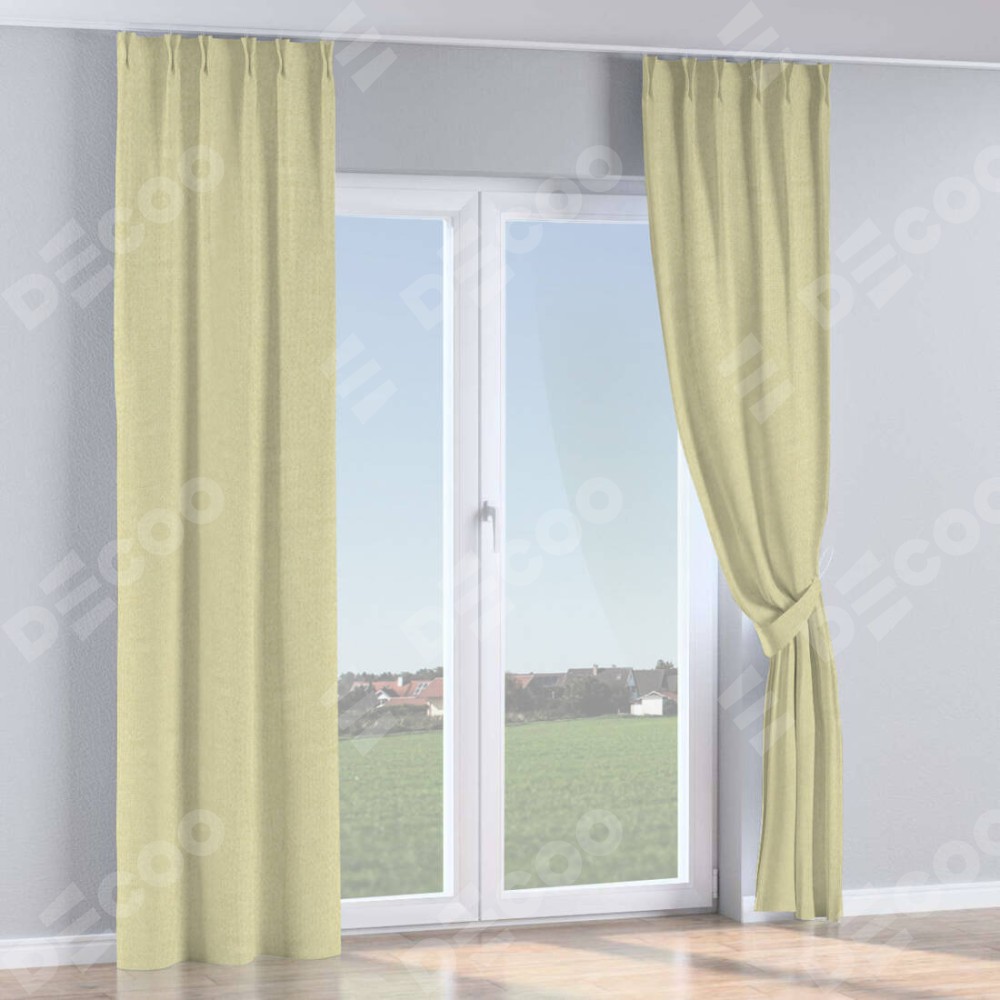 Комплект прямых штор, от производителя «Cortin», пошиты из ткани лён димаут шампань, артикул ткани 90994. С изнаночной стороны в верхней части штор пристрачивается шторная лента с декоративными складками «Кустик». Для создания элегантных складок прямые шторы шьются по стандарту с коэффициентом 1:2 (на 100 см. ширины проёма 200 см. ширины ткани).
