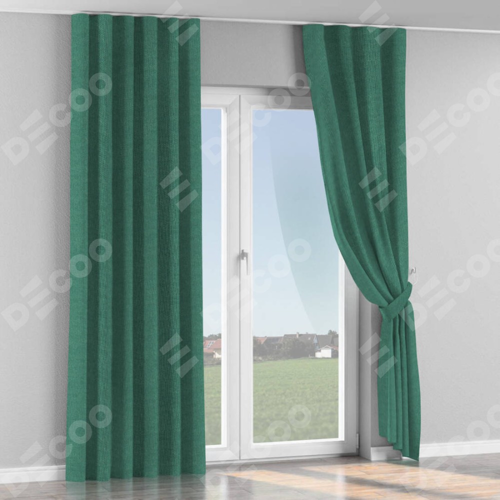 Комплект прямых штор, от производителя «Cortin», пошиты из ткани лён димаут светло-бирюзовый, артикул ткани 91005. С изнаночной стороны в верхней части штор пристрачивается шторная лента с декоративными складками «Волна». Для создания элегантных складок прямые шторы шьются по стандарту с коэффициентом 1:2 (на 100 см. ширины проёма 200 см. ширины ткани).