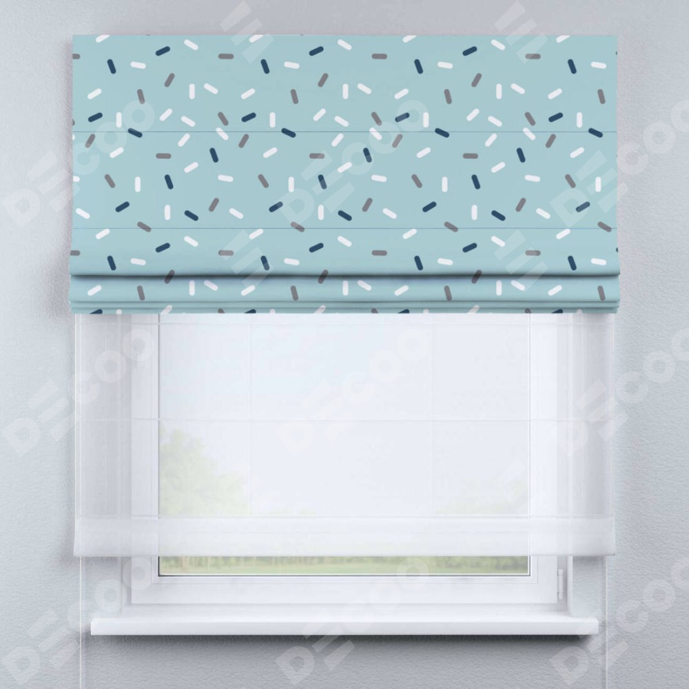 Римская штора день-ночь производителя «Cortin», используется для проёма, пошита из двух полотен, с лицевой блэкаут с нанесением сублимационной печати «Короткие линии», вторая ткань тюль (по стандарту комплектуется тюль белого цвета артикул V-01). Имеет универсальный механизм и подходит для монтажа: на потолок, на стену и в нишу.