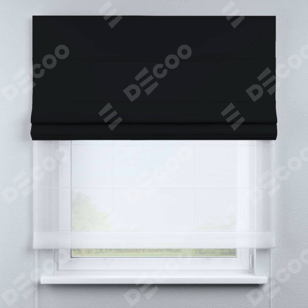 Двойная римская штора «День-ночь» от производителя Cortin предназначена для использования в проёмах. Эта штора уникальна тем, что состоит из двух полотен. На лицевой стороне находится однотонный черный блэкаут (артикул: 91571−2), обеспечивающий эффективное затемнение. В комплект также входит вторая ткань — легкий белый тюль (артикул: V-01), который добавляет изящества и легкости оформлению окна. Кроме того, доступны и другие разновидности ткани тюль, выбор которых доступен по  ссылке .