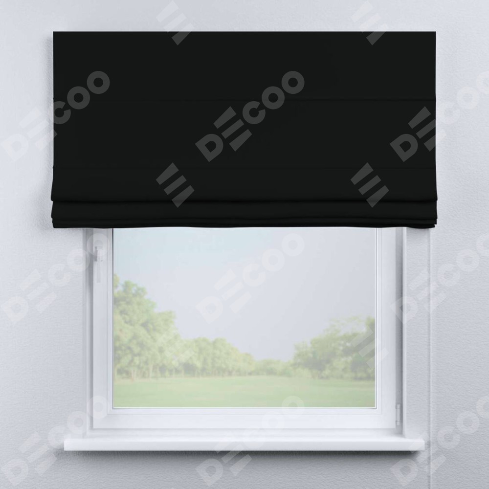 Римская штора производителя «Cortin», используется для проёма, пошита из ткани блэкаут однотонный черный, артикул ткани 91571−2. Имеет универсальный механизм и подходит для монтажа: на потолок, на стену и в нишу.