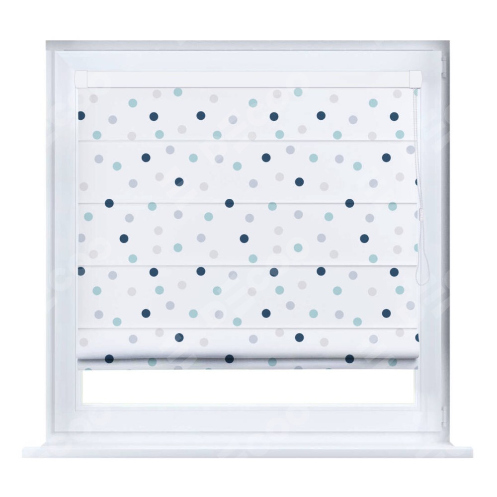 Римская штора производителя «Cortin», устанавливается на створку окна, пошита из ткани блэкаут с нанесением сублимационной печати «Точки». Штора шьётся по индивидуальным размерам, для данного типа римской шторы возможная ширина от 35 до 150 см., высота до 250 см.