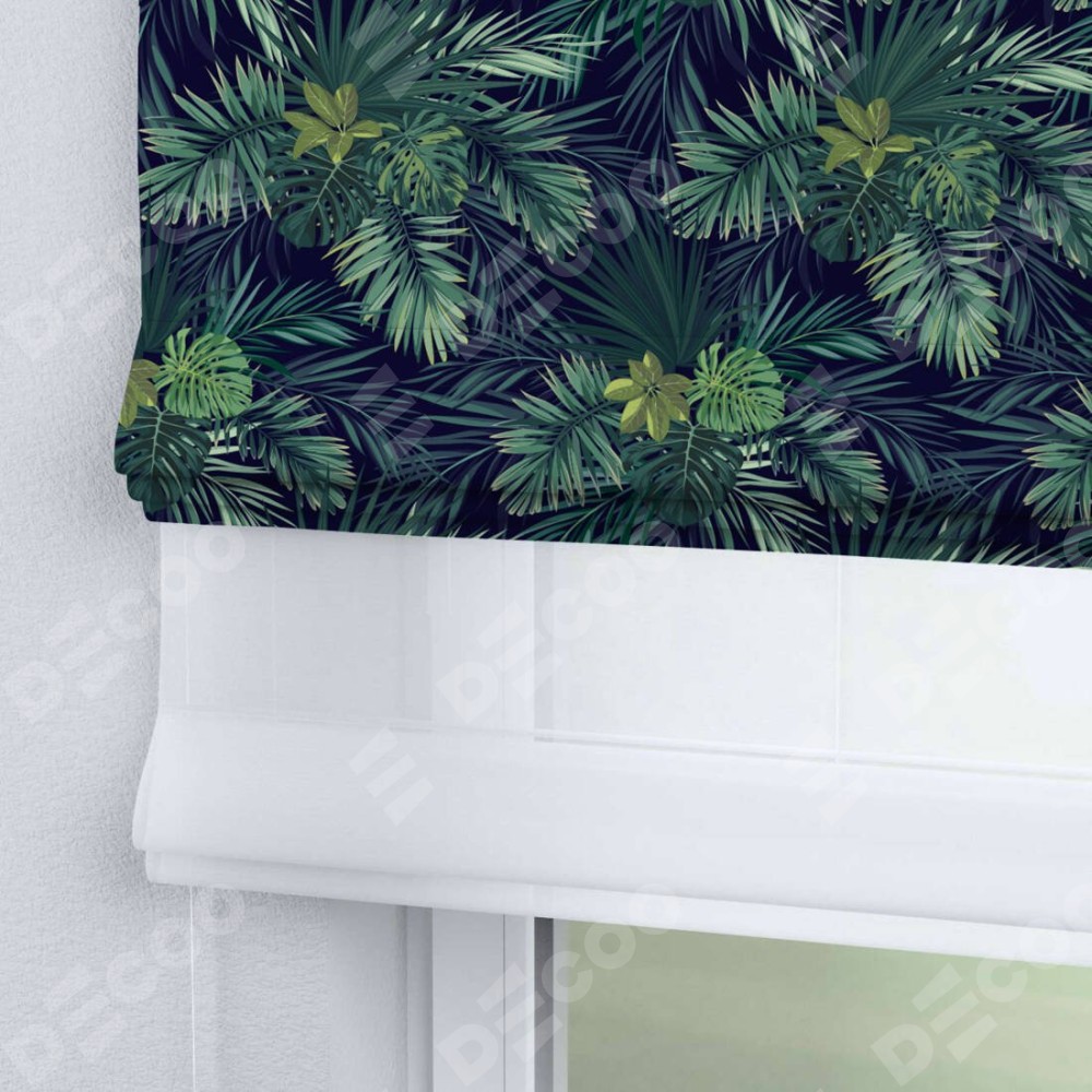 Римская штора день-ночь производителя «Cortin», используется для проёма, пошита из двух полотен, с лицевой блэкаут с нанесением сублимационной печати «Пальмовые листья», вторая ткань тюль (по стандарту комплектуется тюль белого цвета артикул V-01). Имеет универсальный механизм и подходит для монтажа: на потолок, на стену и в нишу.