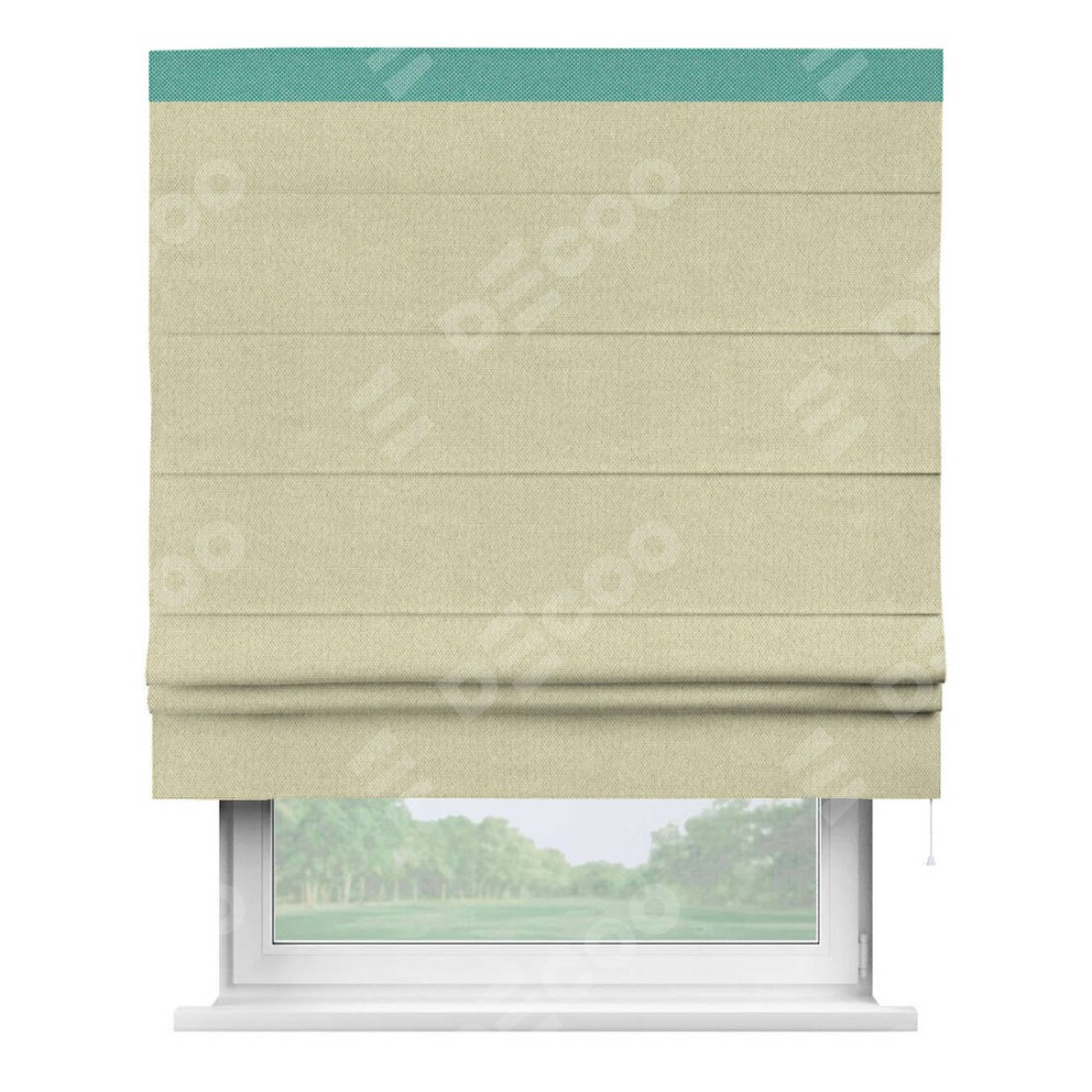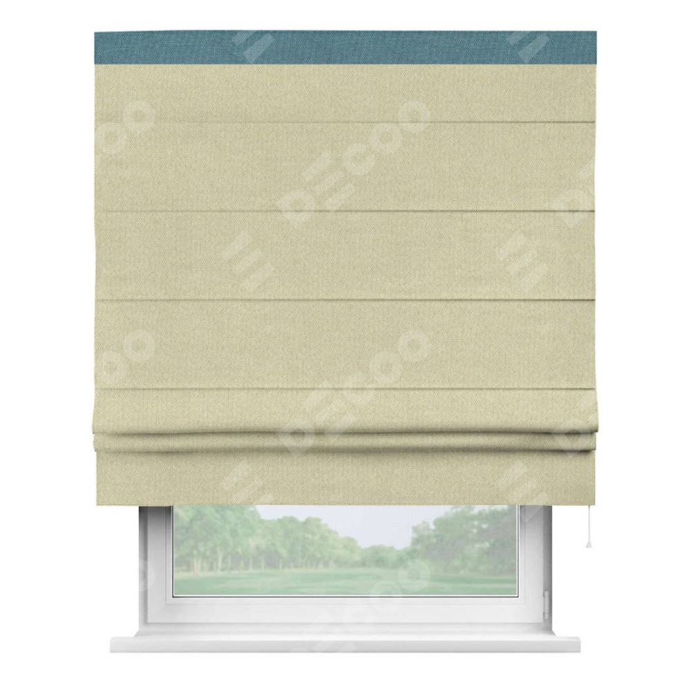Римская штора производителя «Cortin», используется для проёма, пошита из ткани лён димаут шампань, артикул 90994. Отделка шторы кантом «Кинг», ткань для канта используется из льна димаут разной расцветки на выбор. Имеет универсальный механизм и подходит для монтажа: на потолок, на стену и в нишу.