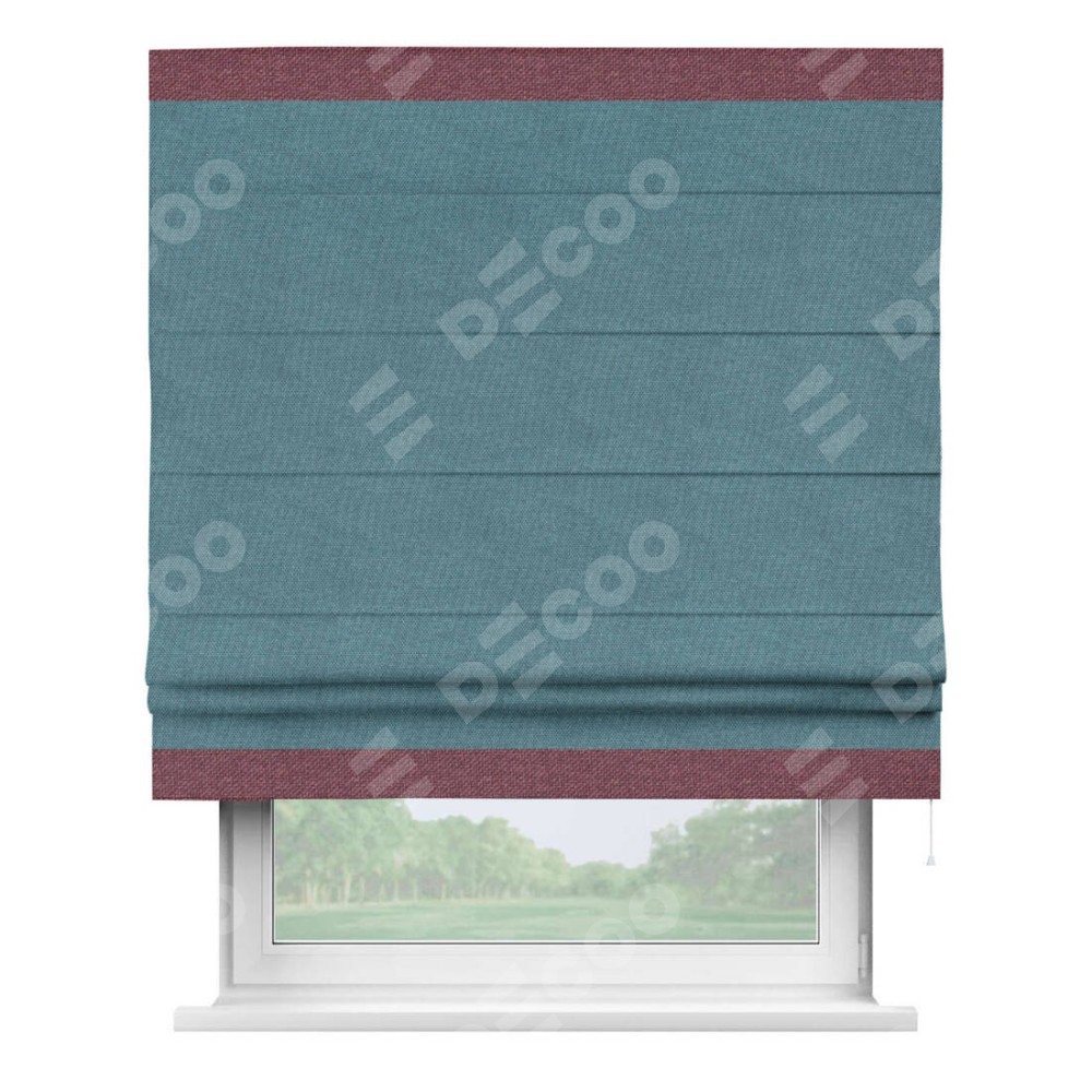 Римская штора производителя «Cortin», используется для проёма, пошита из ткани лён димаут светло-синий, артикул 91007. Отделка шторы кантом «Горизонт», ткань для канта используется из льна димаут разной расцветки на выбор. Имеет универсальный механизм и подходит для монтажа: на потолок, на стену и в нишу.