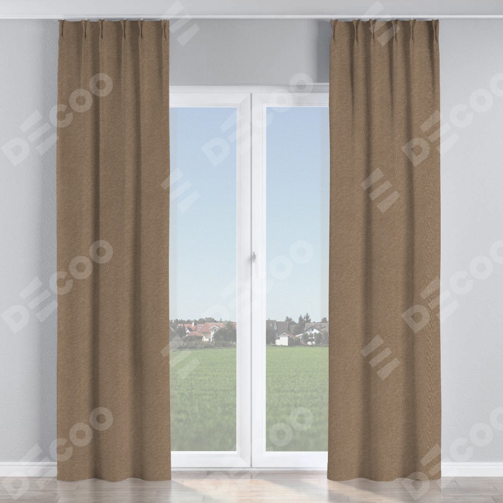 Комплект прямых штор, от производителя «Cortin», пошиты из ткани лён димаут коричневый, артикул ткани 90996. С изнаночной стороны в верхней части штор пристрачивается шторная лента с декоративными складками «Кустик». Для создания элегантных складок прямые шторы шьются по стандарту с коэффициентом 1:2 (на 100 см. ширины проёма 200 см. ширины ткани).