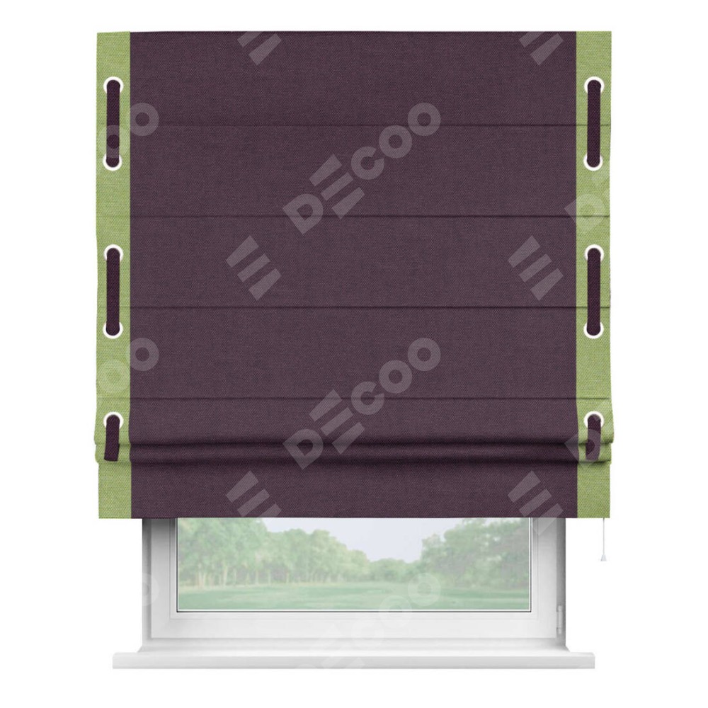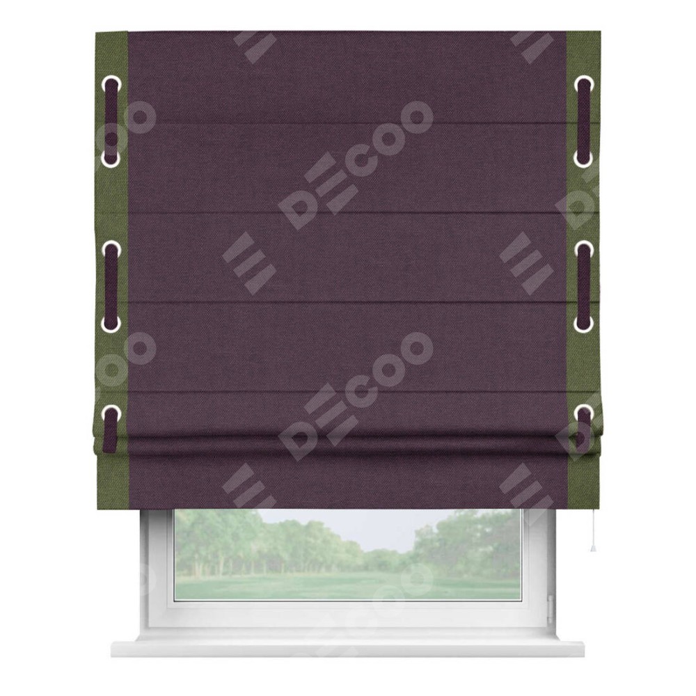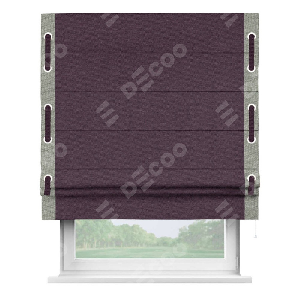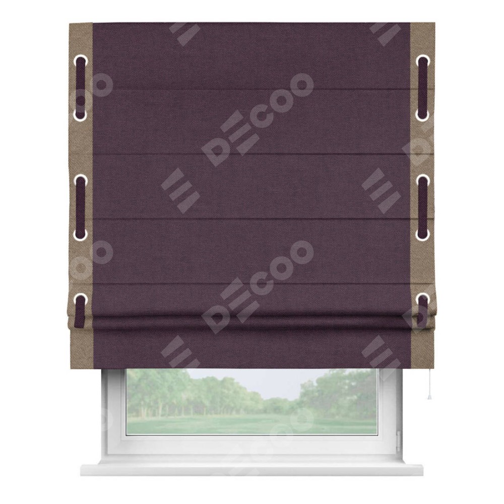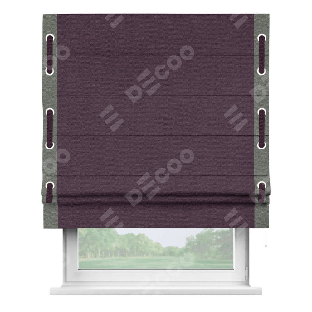 Римская штора «Кортин» для проема, лён димаут фиолетовый с кантом Стрим Дуо (люверсы с пояском)