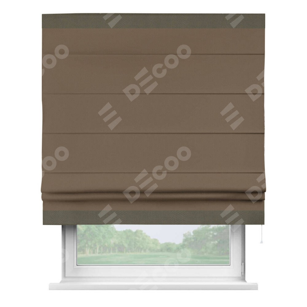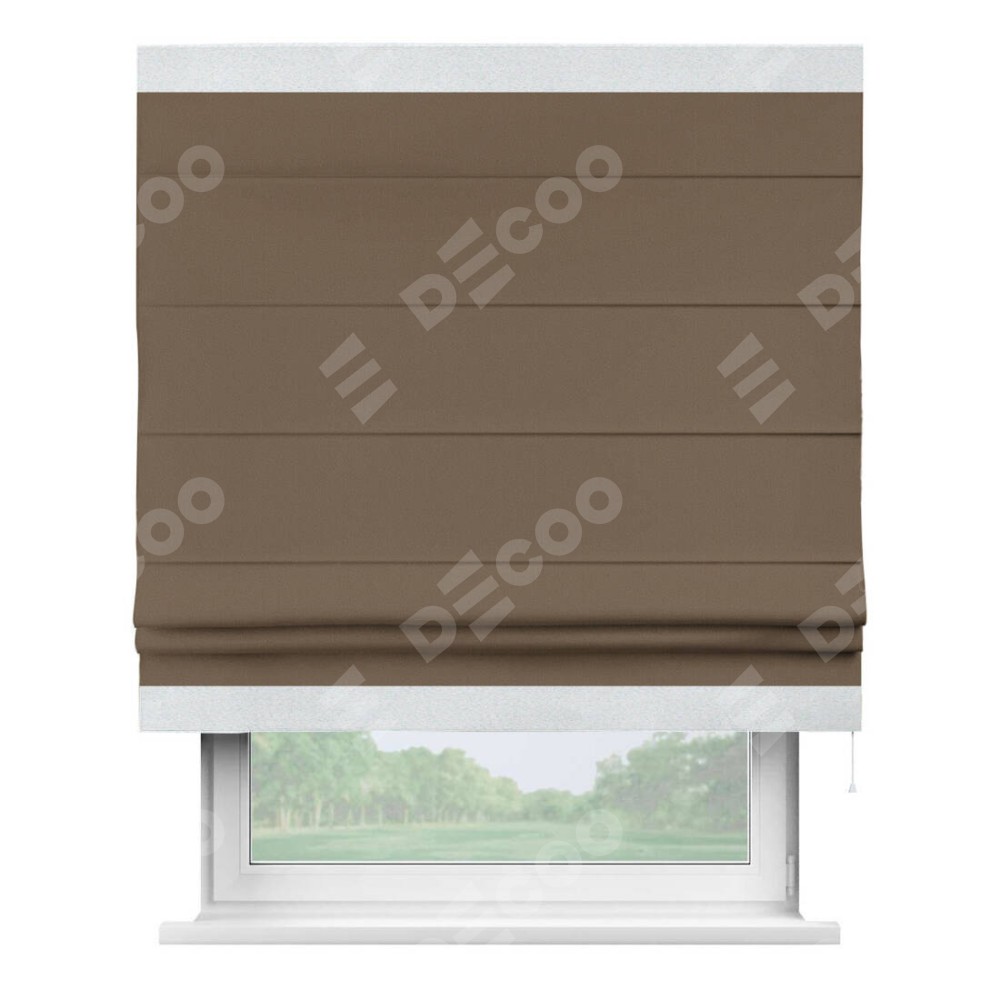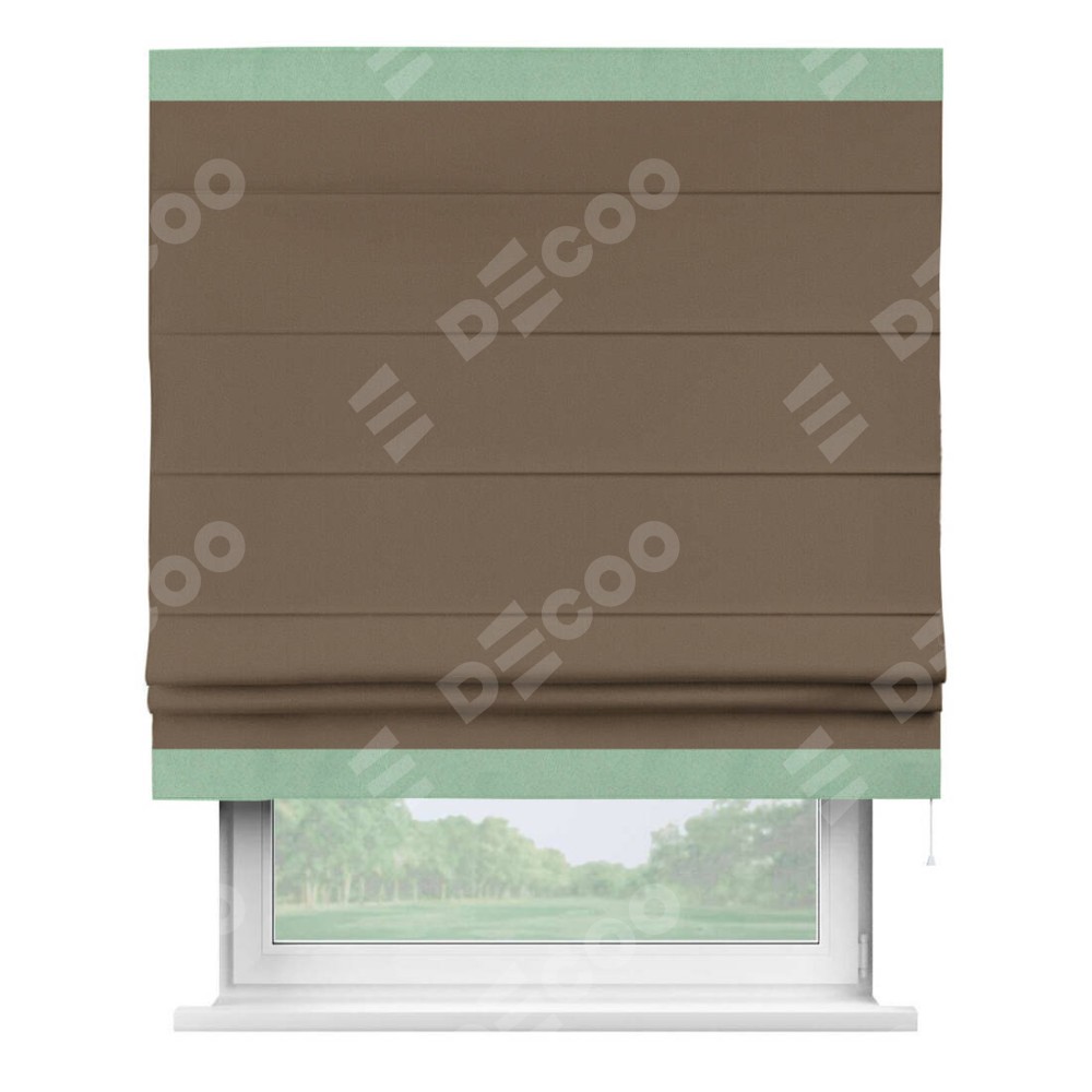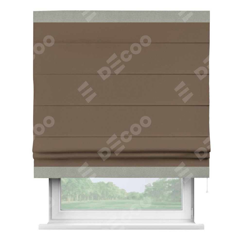 Римская штора производителя «Cortin», используется для проёма, пошита из ткани блэкаут однотонный коричневый, артикул ткани 91334. Отделка шторы кантом «Горизонт», ткань для канта используется из блэкаута однотонного разной расцветки на выбор. Имеет универсальный механизм и подходит для монтажа: на потолок, на стену и в нишу.
