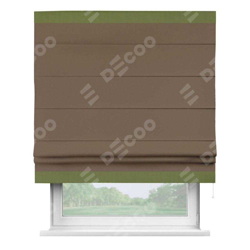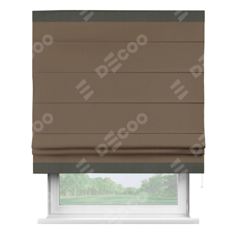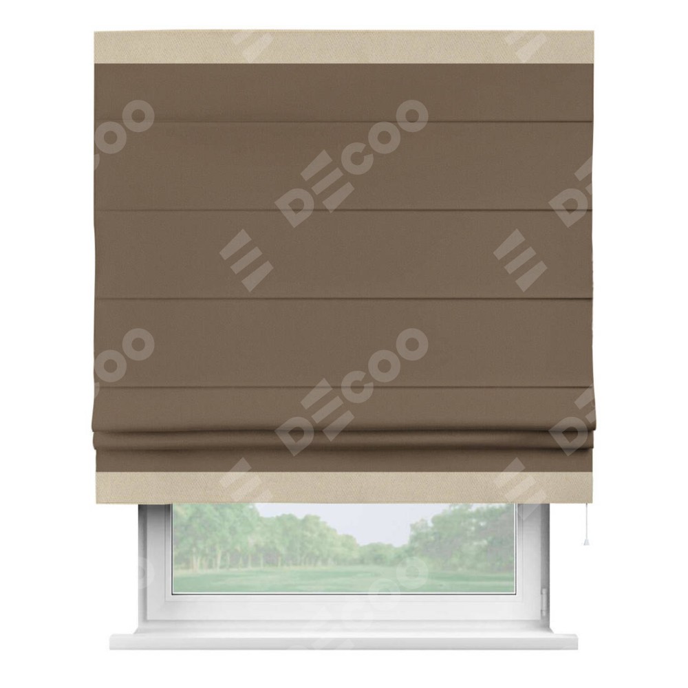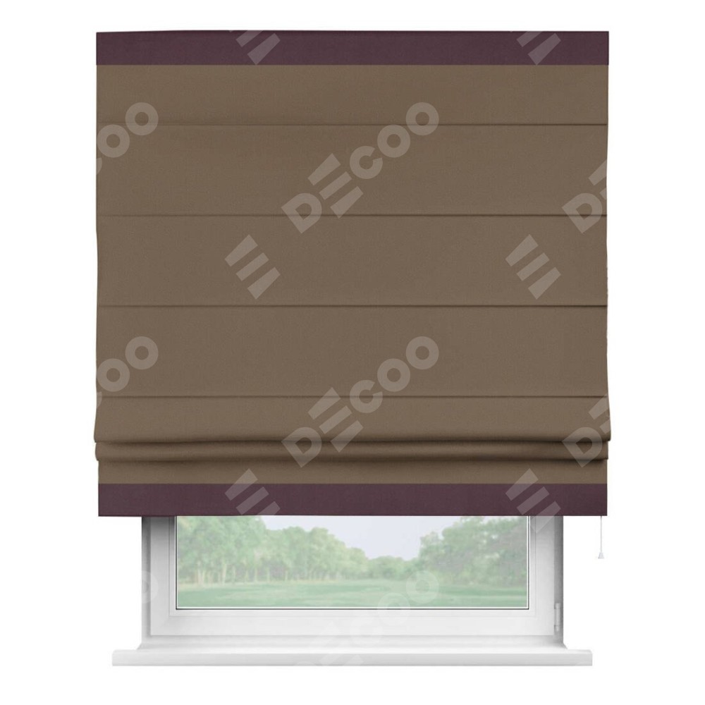 Римская штора производителя «Cortin», используется для проёма, пошита из ткани блэкаут однотонный коричневый, артикул ткани 91334. Отделка шторы кантом «Горизонт», ткань для канта используется из блэкаута однотонного разной расцветки на выбор. Имеет универсальный механизм и подходит для монтажа: на потолок, на стену и в нишу.