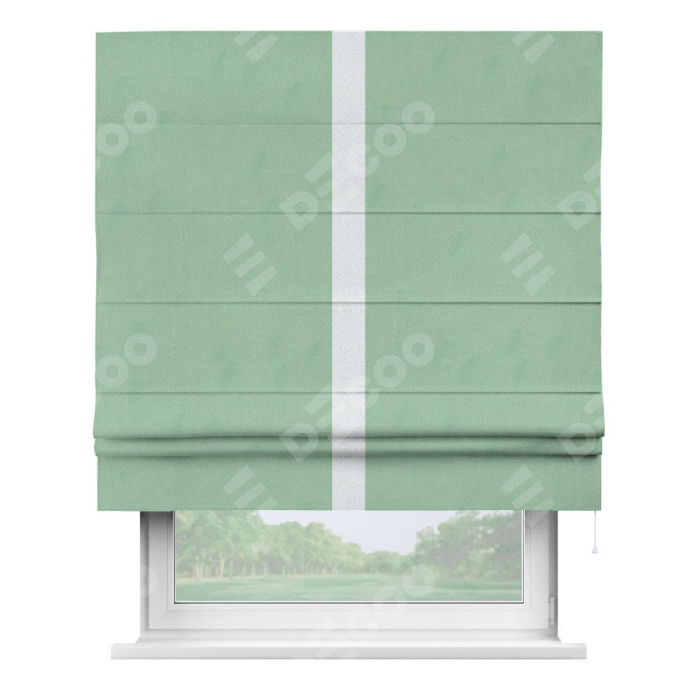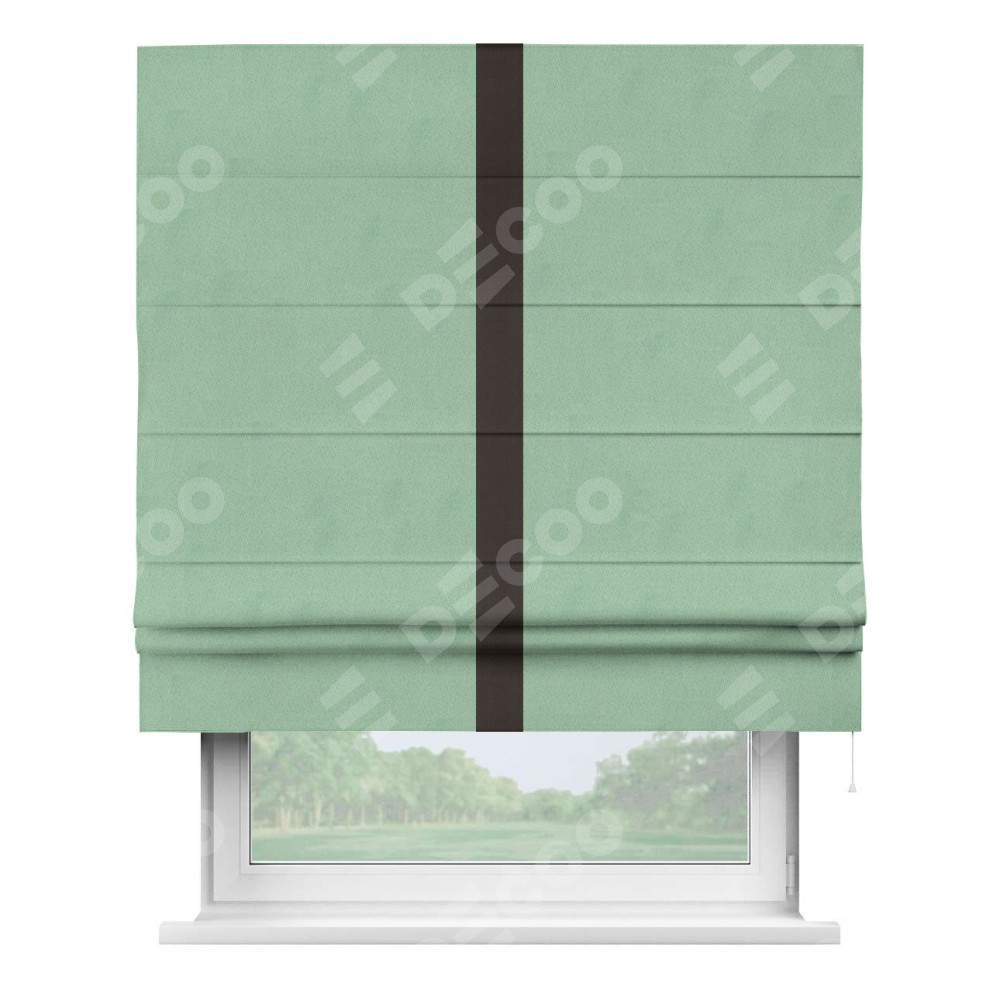 Римская штора производителя «Cortin», используется для проёма, пошита из ткани блэкаут однотонный ментоловый, артикул ткани 91572−1. Отделка шторы кантом «Хайвей», ткань для канта используется из блэкаута однотонного разной расцветки на выбор. Имеет универсальный механизм и подходит для монтажа: на потолок, на стену и в нишу.