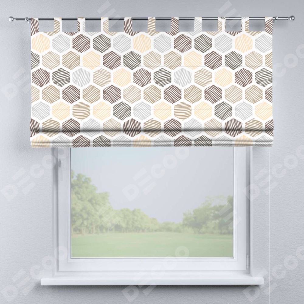 Римская штора производителя «Cortin», используется для проёма, пошита из ткани блэкаут с нанесением сублимационной печати «Мозаика соты». Данная модель пошита на петлях, комплектуется на выбор круглым карнизом и подходит для монтажа на стену. Римская штора на петлях имеет простую систему регулировки высоты, отличительным преимуществом данной модели является простой способ монтажа. Достаточно повесить ее на трубу и штора готова!