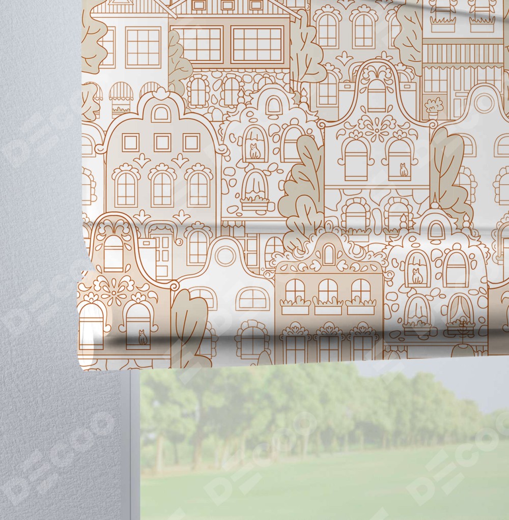 Римская штора производителя «Cortin», используется для проёма, пошита из ткани блэкаут с нанесением сублимационной печати «Милый городок». Данная модель пошита на петлях, комплектуется на выбор круглым карнизом и подходит для монтажа на стену. Римская штора на петлях имеет простую систему регулировки высоты, отличительным преимуществом данной модели является простой способ монтажа. Достаточно повесить ее на трубу и штора готова!