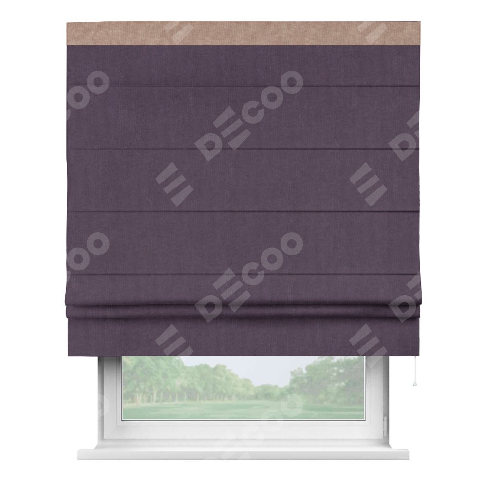 Римская штора производителя «Cortin», используется для проёма, пошита из ткани канвас баклажановый, артикул ткани v-111. Отделка шторы кантом «Кинг» (розовая пудра v-34), ткань для канта используется из канваса разной расцветки на выбор. Имеет универсальный механизм и подходит для монтажа: на потолок, на стену и в нишу.