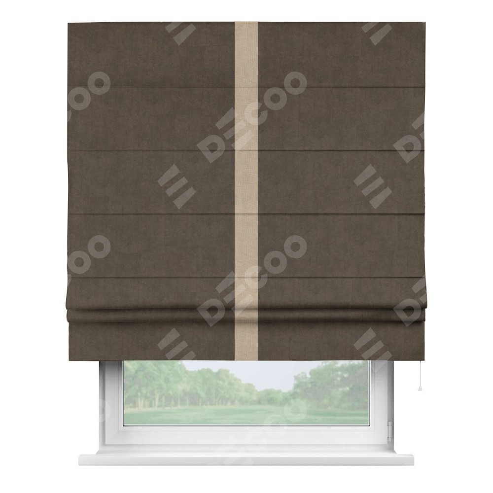 Римская штора производителя «Cortin», используется для проёма, пошита из ткани канвас коричневый, артикул ткани v-29. Отделка шторы кантом «Хайвей» (пудровый v-35), ткань для канта используется из канваса разной расцветки на выбор. Имеет универсальный механизм и подходит для монтажа: на потолок, на стену и в нишу.