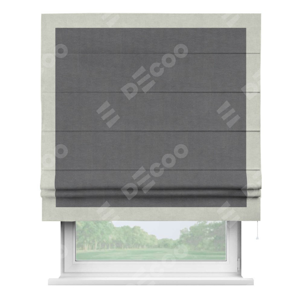 Римская штора производителя «Cortin», используется для проёма, пошита из ткани канвас мокрый асфальт, артикул ткани v-1083. Отделка шторы кантом «Чесс» (светло-серый v-371), ткань для канта используется из канваса разной расцветки на выбор. Имеет универсальный механизм и подходит для монтажа: на потолок, на стену и в нишу.