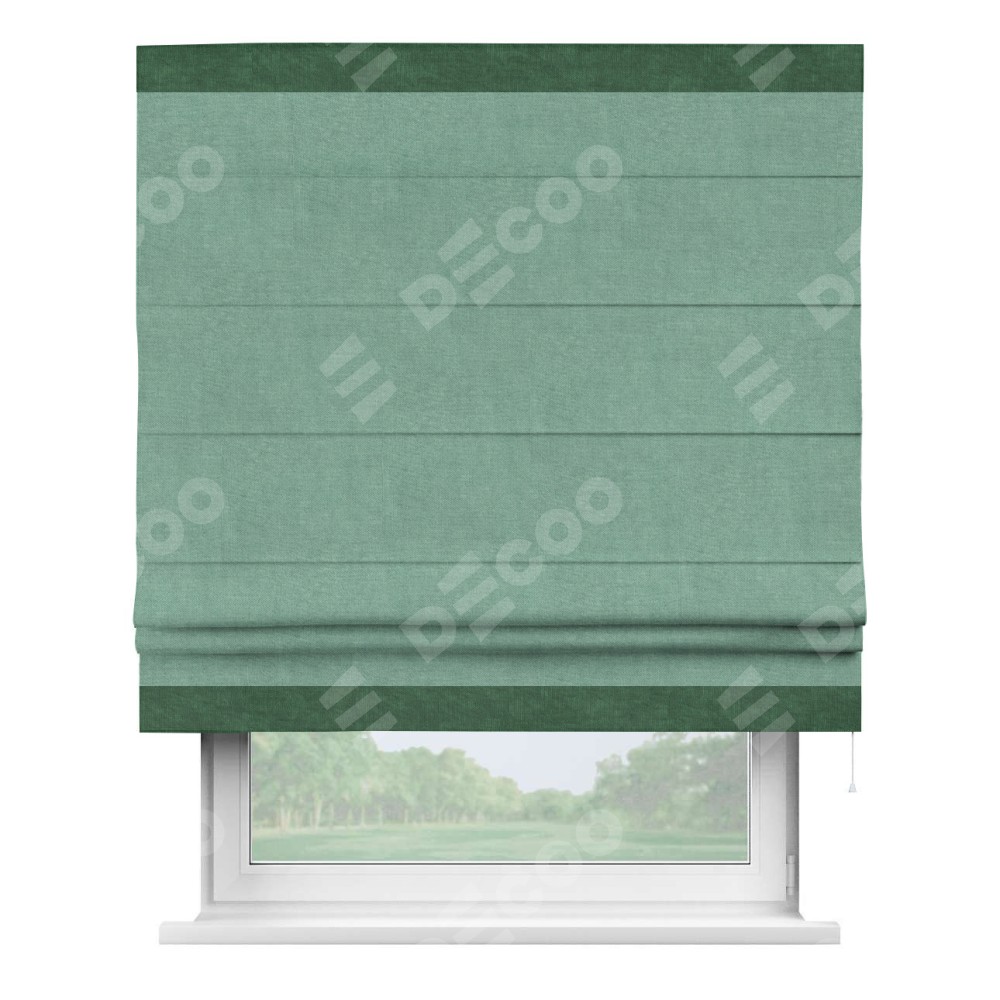 Римская штора производителя «Cortin», используется для проёма, пошита из ткани канвас мятный, артикул ткани v-248. Отделка шторы кантом «Горизонт» (тёмно-зелёный v-469), ткань для канта используется из канваса разной расцветки на выбор. Имеет универсальный механизм и подходит для монтажа: на потолок, на стену и в нишу.