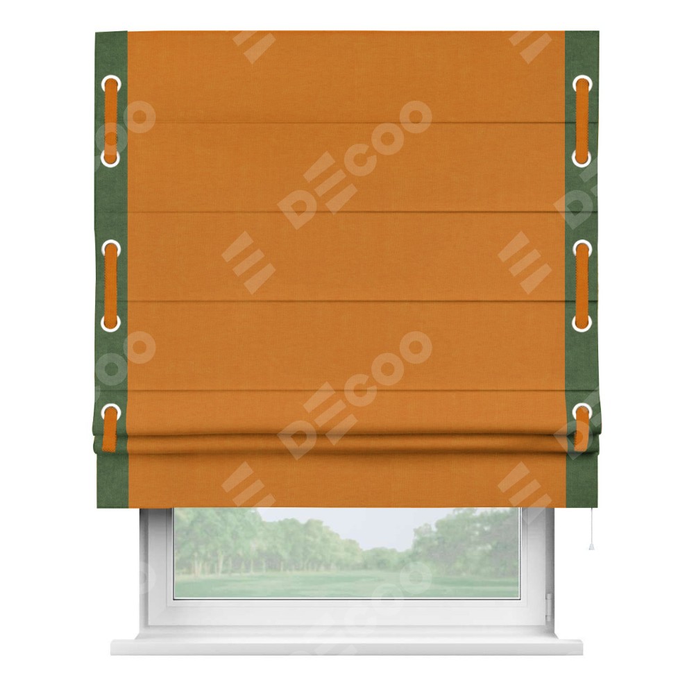 Римская штора производителя «Cortin», используется для проёма, пошита из ткани канвас оранжевый, артикул ткани v-106. Отделка шторы кантом «Стрим Дуо» (зелёный v-16) на кантах расположены люверсы с пояском, ткань для канта используется из канваса разной расцветки на выбор. Ткань для пояска обычно используется из основной ткани шторы, а так же можно сделать из любой расцветки по желанию. Имеет универсальный механизм и подходит для монтажа: на потолок, на стену и в нишу.