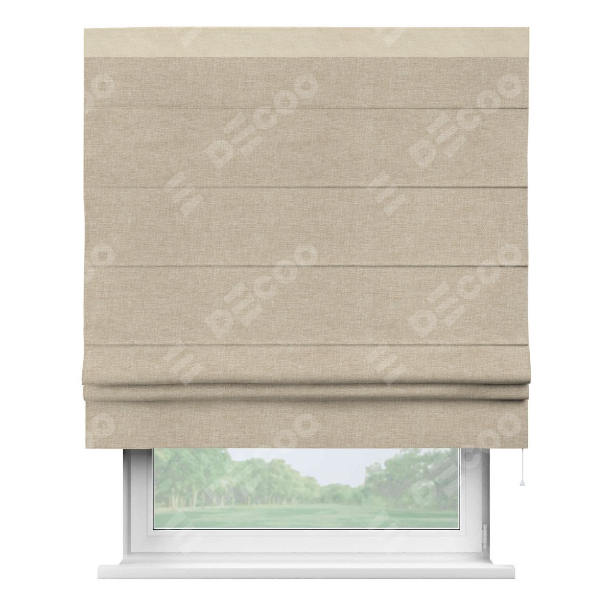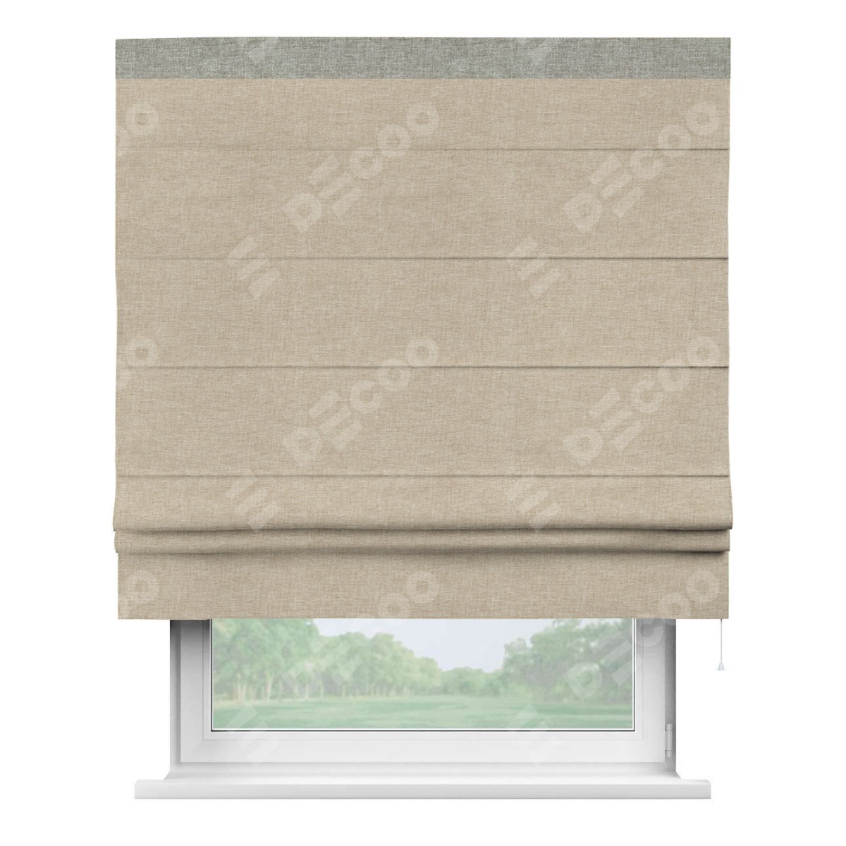 Римская штора производителя «Cortin», используется для проёма, пошита из ткани лён кашемир бежевый, артикул 17206. Отделка шторы кантом «Кинг», ткань для канта используется из льна разной расцветки на выбор. Имеет универсальный механизм и подходит для монтажа: на потолок, на стену и в нишу.