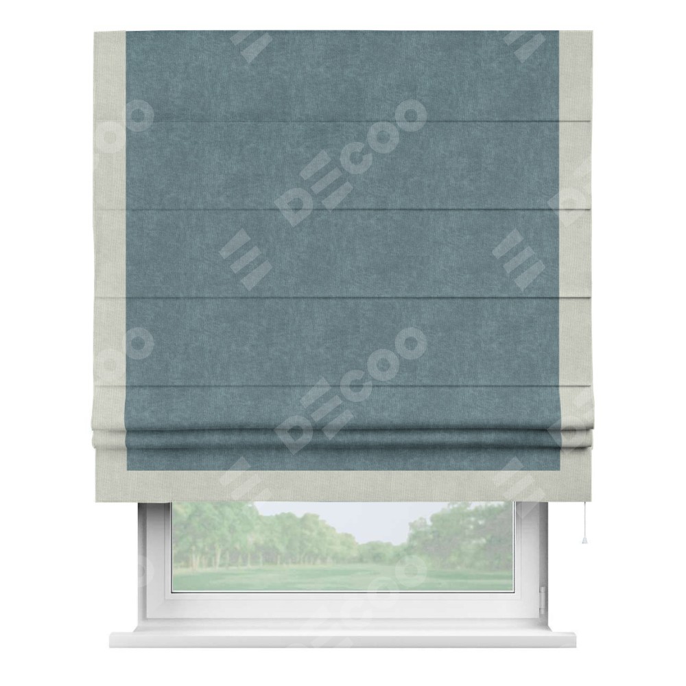 Римская штора производителя «Cortin», используется для проёма, пошита из ткани канвас серо-голубой, артикул ткани v-330. Отделка шторы кантом «Виктория» (светло-серый v-371), ткань для канта используется из канваса разной расцветки на выбор. Имеет универсальный механизм и подходит для монтажа: на потолок, на стену и в нишу.