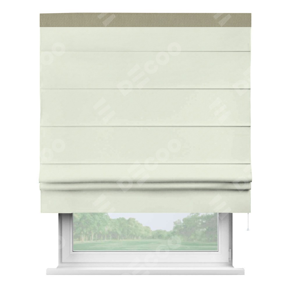Римская штора производителя «Cortin», используется для проёма, пошита из ткани канвас сливочный, артикул ткани v-94. Отделка шторы кантом «Кинг» (латте v-12490), ткань для канта используется из канваса разной расцветки на выбор. Имеет универсальный механизм и подходит для монтажа: на потолок, на стену и в нишу.