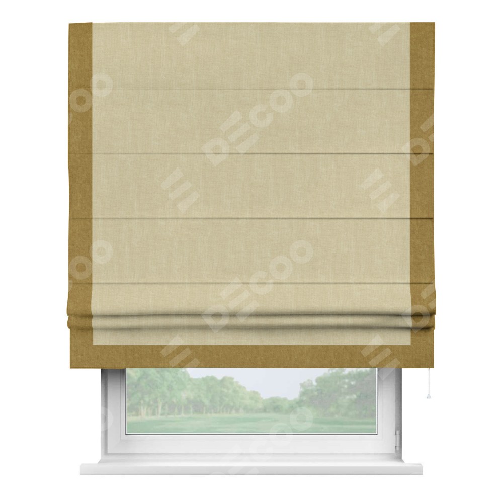 Римская штора производителя «Cortin», используется для проёма, пошита из ткани канвас тёмно-бежевый, артикул ткани v-196. Отделка шторы кантом «Виктория» (горчица v-476), ткань для канта используется из канваса разной расцветки на выбор. Имеет универсальный механизм и подходит для монтажа: на потолок, на стену и в нишу.