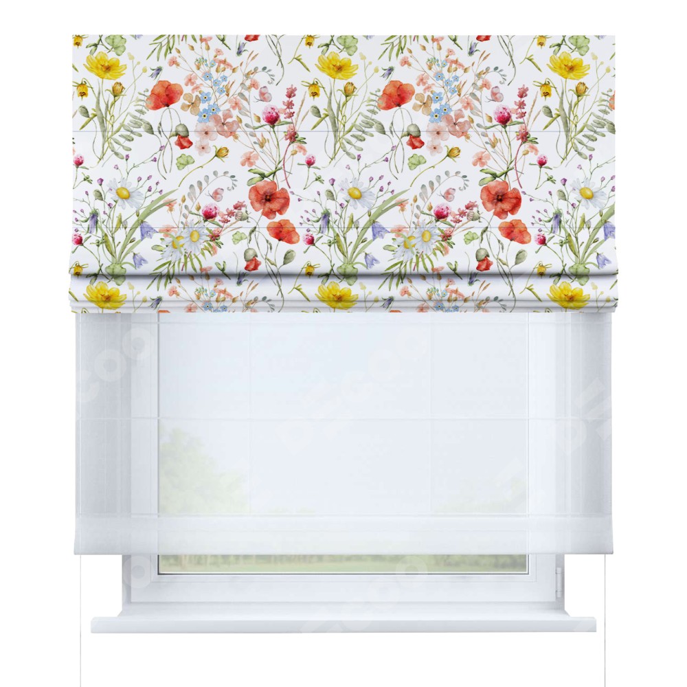 Двойная римская штора «День-ночь» от производителя Cortin предназначена для использования в проёмах. Эта штора уникальна тем, что состоит из двух полотен. На лицевой стороне находится блэкаут с нанесением сублимационной печати «Полевые маки», обеспечивающий эффективное затемнение. В комплект также входит вторая ткань — легкий белый тюль (артикул: V-01), который добавляет изящества и легкости оформлению окна. Кроме того, доступны и другие разновидности ткани тюль, выбор которых доступен по  ссылке .