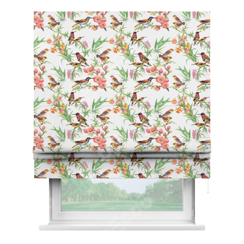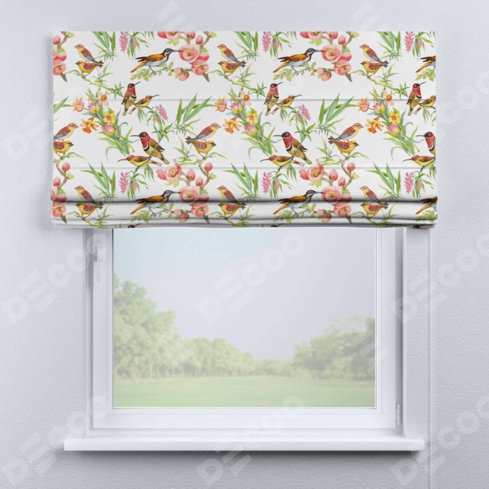 Классическая римская штора производителя «Cortin», пошита из ткани блэкаут с нанесением сублимационной печати «Певчие птички». Имеет универсальный механизм и подходит для монтажа: на потолок, на стену и в нишу.