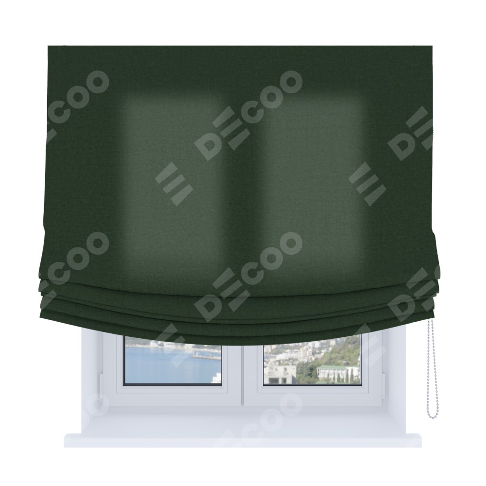 Римская штора Soft производителя «Cortin», используется для проёма, пошита из ткани канвас глубокий зелёный, артикул ткани v-588. Имеет универсальный механизм и подходит для монтажа: на потолок, на стену и в нишу. В отличие от стандартных римских штор, римская штора Soft не имеет горизонтальных вставок и нижнего отвеса. Это позволяет ткани произвольно драпироваться в свободные мягкие складки.