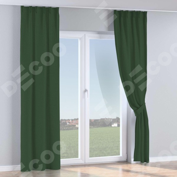 Комплект прямых штор, от производителя «Cortin», пошиты из ткани канвас глубокий зелёный, артикул ткани v-588. С изнаночной стороны в верхней части штор пристрачивается шторная лента с декоративными складками «Кустик». Для создания элегантных складок прямые шторы шьются по стандарту с коэффициентом 1:2 (на 100 см. ширины проёма 200 см. ширины ткани).