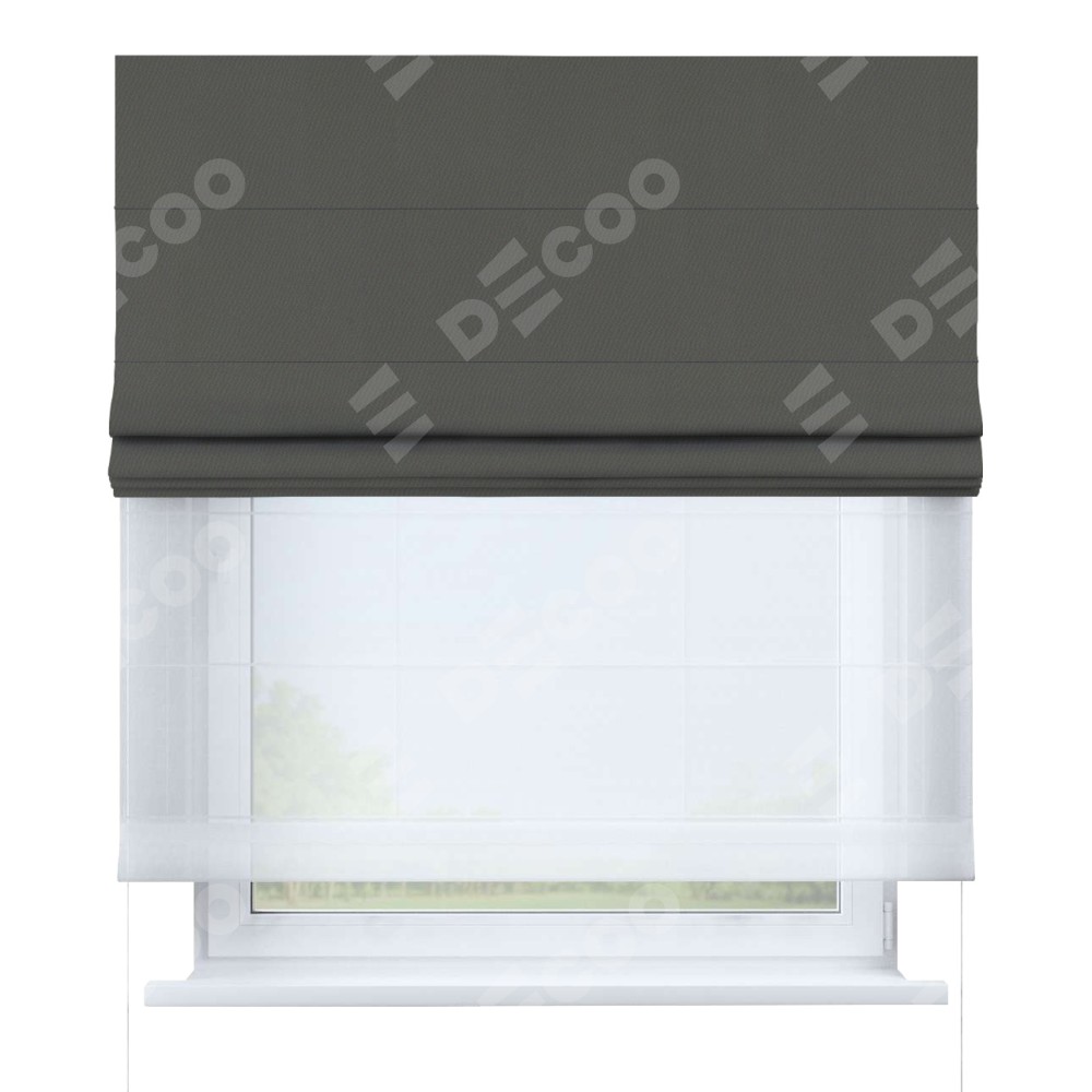 Двойная римская штора «День-ночь» от производителя Cortin предназначена для использования в проёмах. Эта штора уникальна тем, что состоит из двух полотен. На лицевой стороне находится однотонный тёмно-серый блэкаут (артикул: 91570), обеспечивающий эффективное затемнение. В комплект также входит вторая ткань — легкий белый тюль (артикул: V-01), который добавляет изящества и легкости оформлению окна. Кроме того, доступны и другие разновидности ткани тюль, выбор которых доступен по  ссылке .