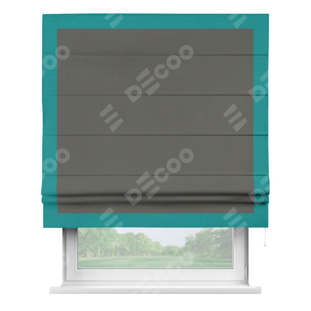Римская штора производителя «Cortin», используется для проёма, пошита из ткани блэкаут однотонный тёмно-серый, артикул ткани 91570. Отделка шторы кантом «Чесс», ткань для канта используется из блэкаута однотонного разной расцветки на выбор. Имеет универсальный механизм и подходит для монтажа: на потолок, на стену и в нишу.