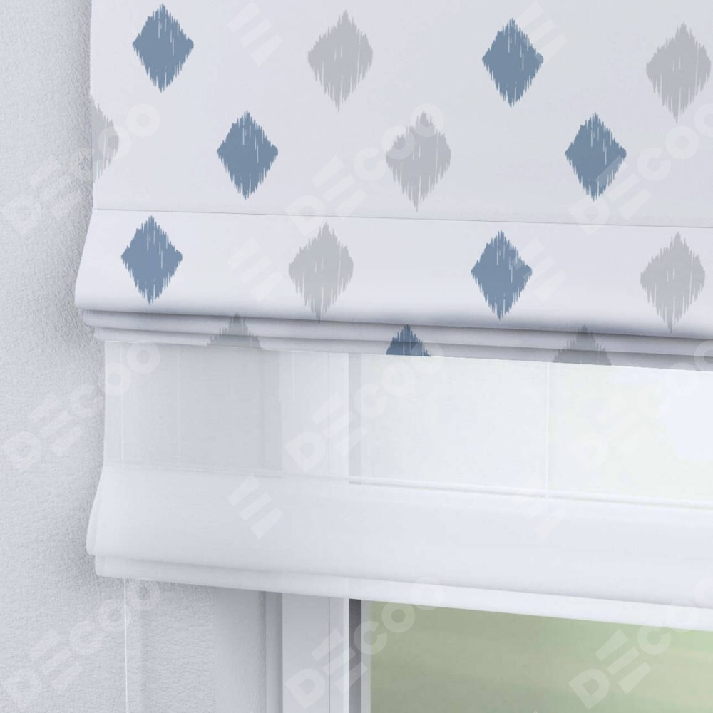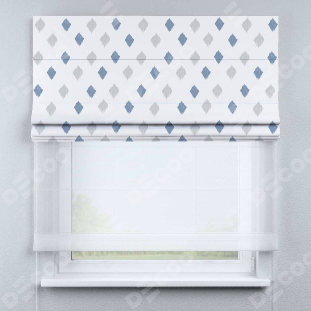 Двойная римская штора «День-ночь» от производителя Cortin предназначена для использования в проёмах. Эта штора уникальна тем, что состоит из двух полотен. На лицевой стороне находится блэкаут с нанесением сублимационной печати «Икат ромбики», обеспечивающий эффективное затемнение. В комплект также входит вторая ткань — легкий белый тюль (артикул: V-01), который добавляет изящества и легкости оформлению окна. Кроме того, доступны и другие разновидности ткани тюль, выбор которых доступен по  ссылке .